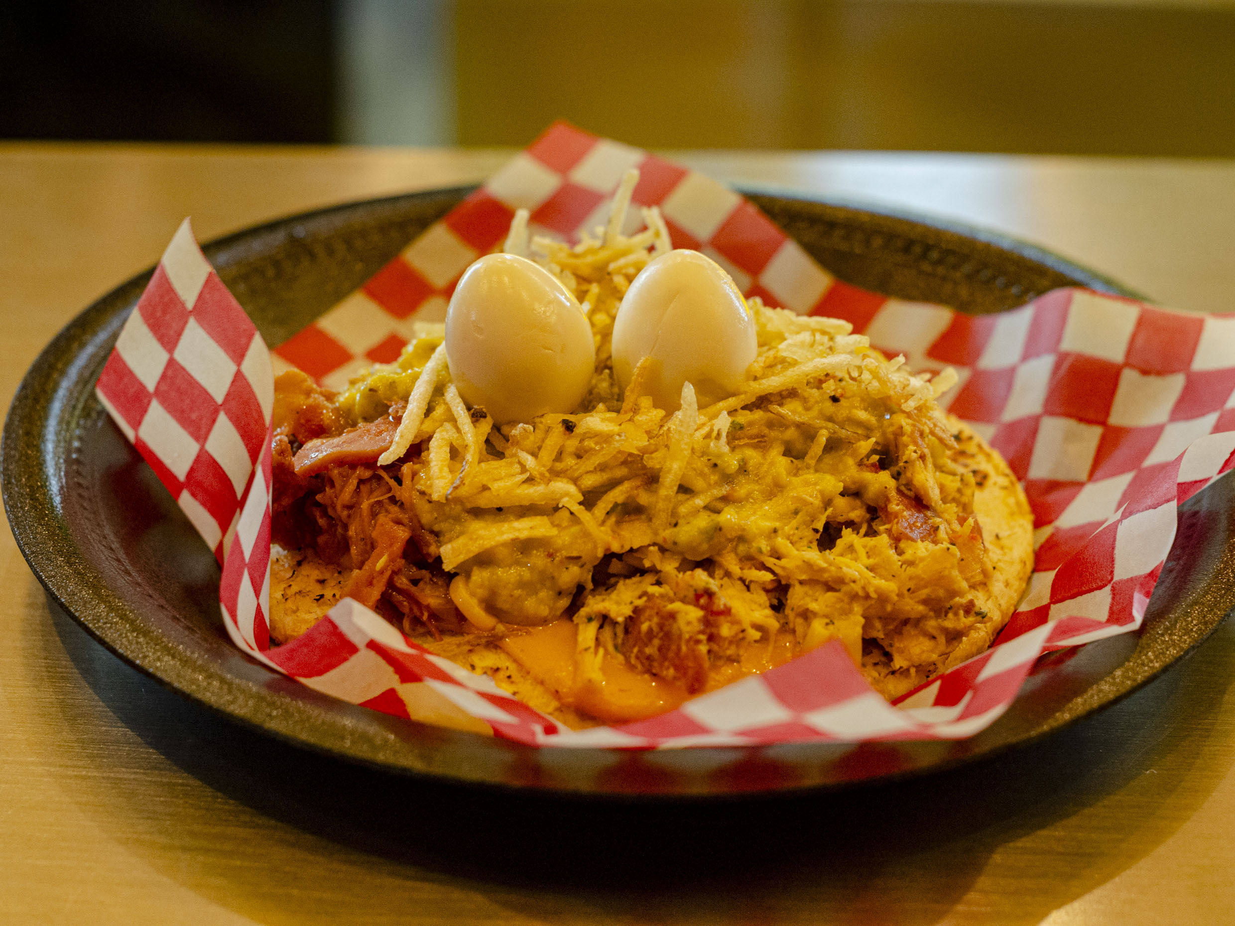 Arepa de maíz, 100% carne de res desmechada en una mezcla de hogao con maicitos, tocineta, queso mozzarella, queso rayado, sour cream, guacamole artesanal, ripio de papa, salsas artesanales y salsas tradicionales.