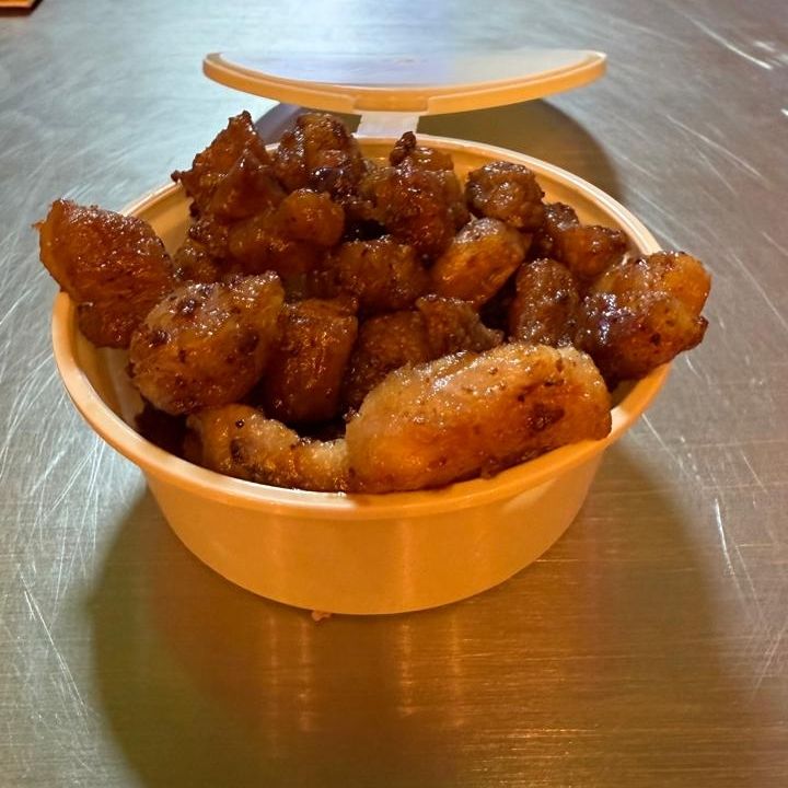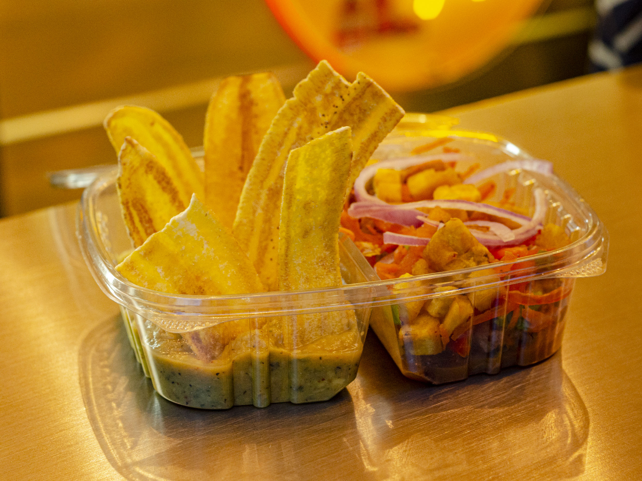 250 g De chicharrón, vegetales, guacamole artesanal más platanitos verdes.