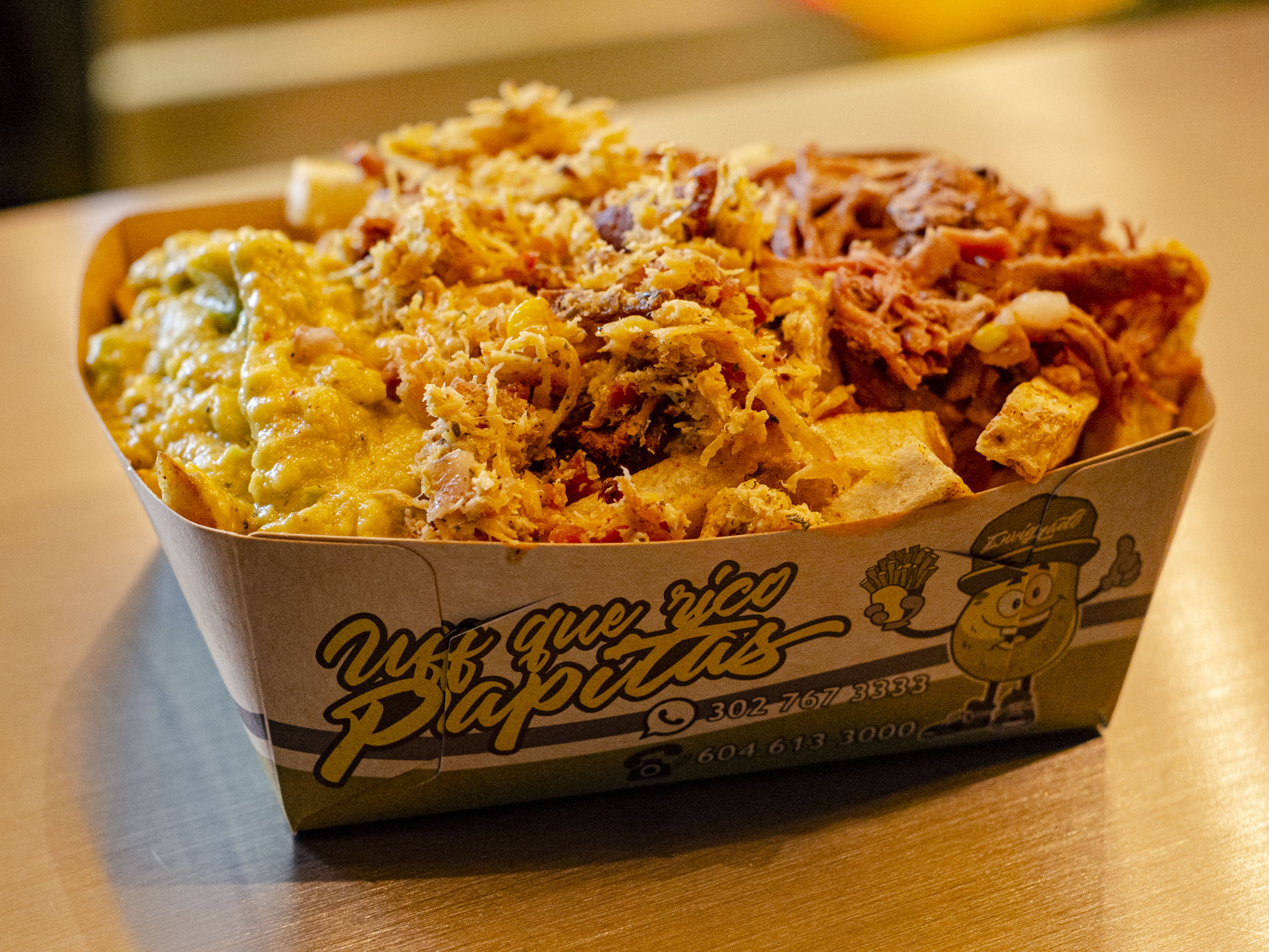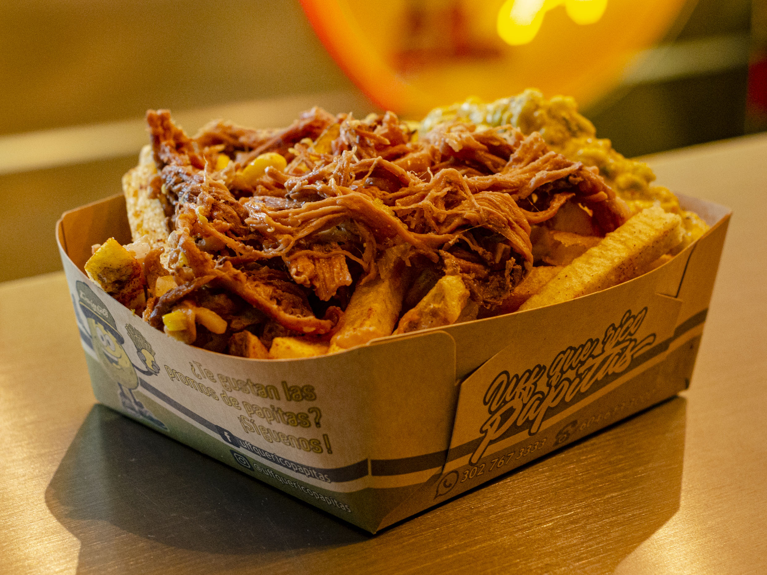400 g Aproximadamente papa artesanal, 100% pollo desmechado en una mezcla con maicitos, tocineta, queso rayado, guacamole artesanal, sour cream, 100% carne de res desmechada en una mezcla de hogao con maicitos, tocineta, salsas artesanales y tradicionales.