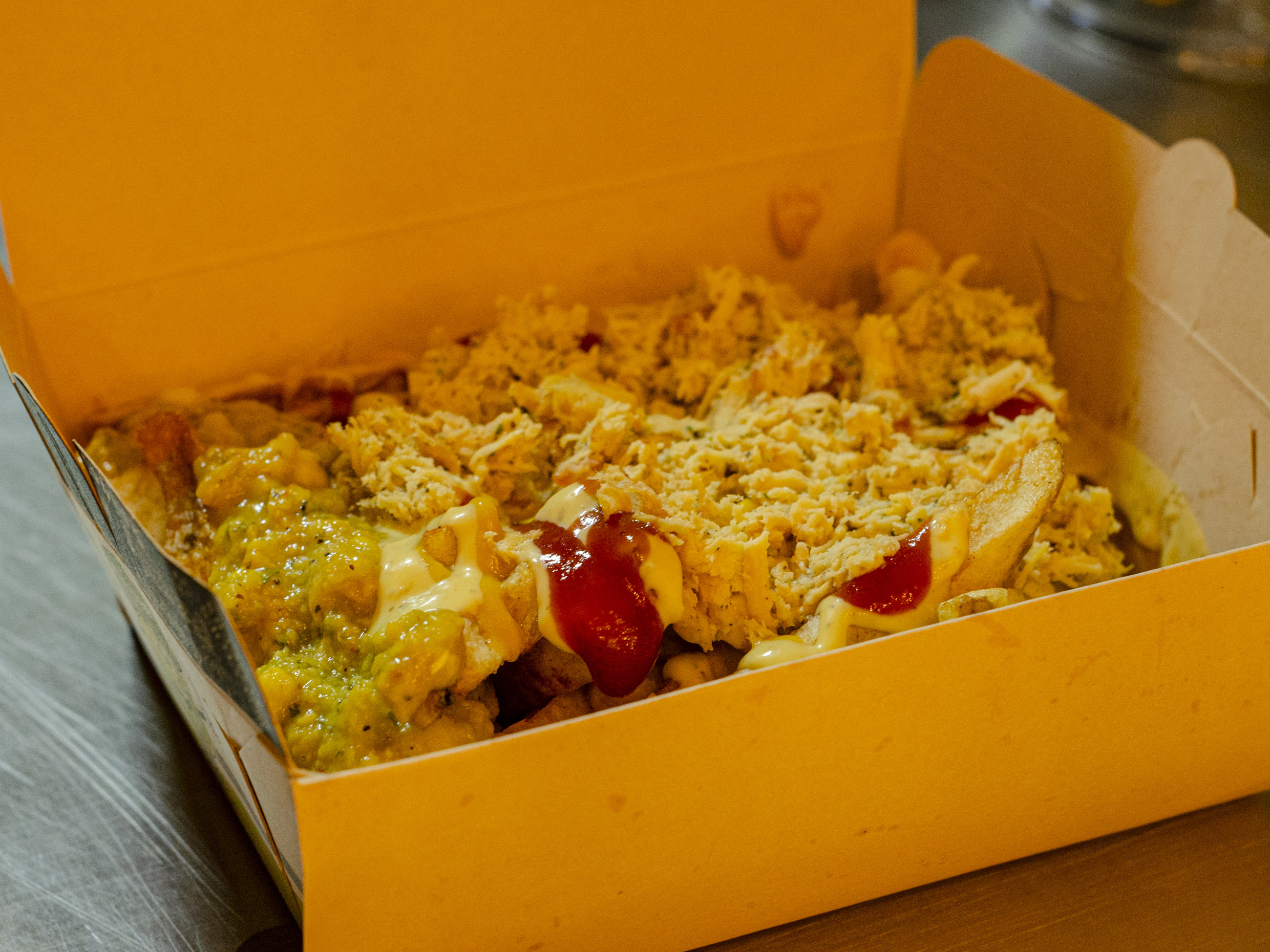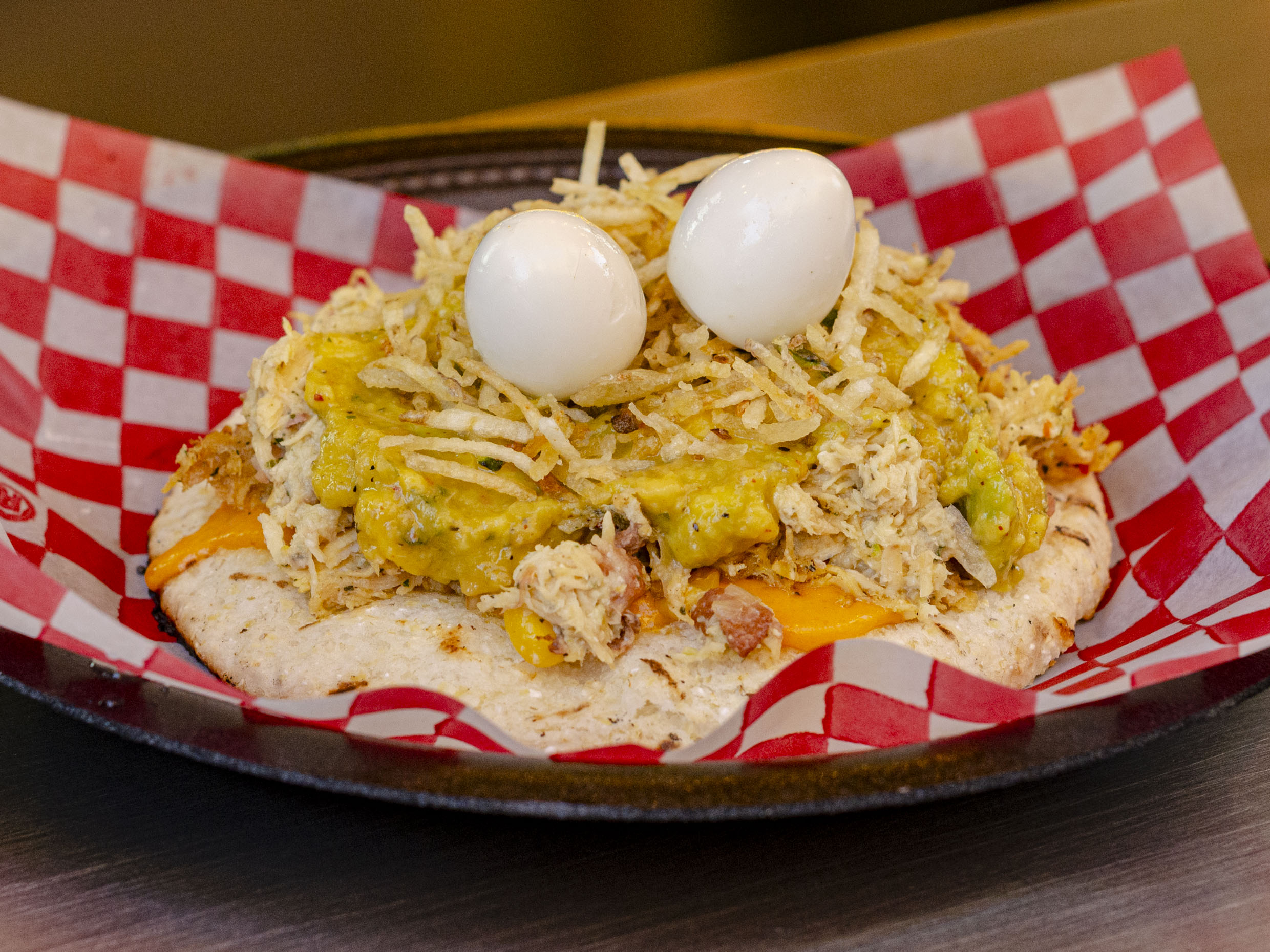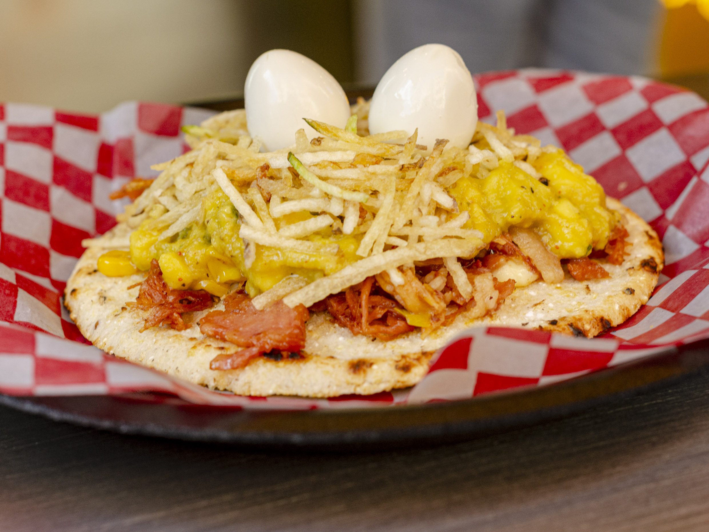 Arepa de maíz, 100% pollo desmechado en una mezcla con maicitos, tocineta, queso mozzarella, queso rayado, sour cream, guacamole artesanal, ripio de papa, salsas artesanales y salsas tradicionales.