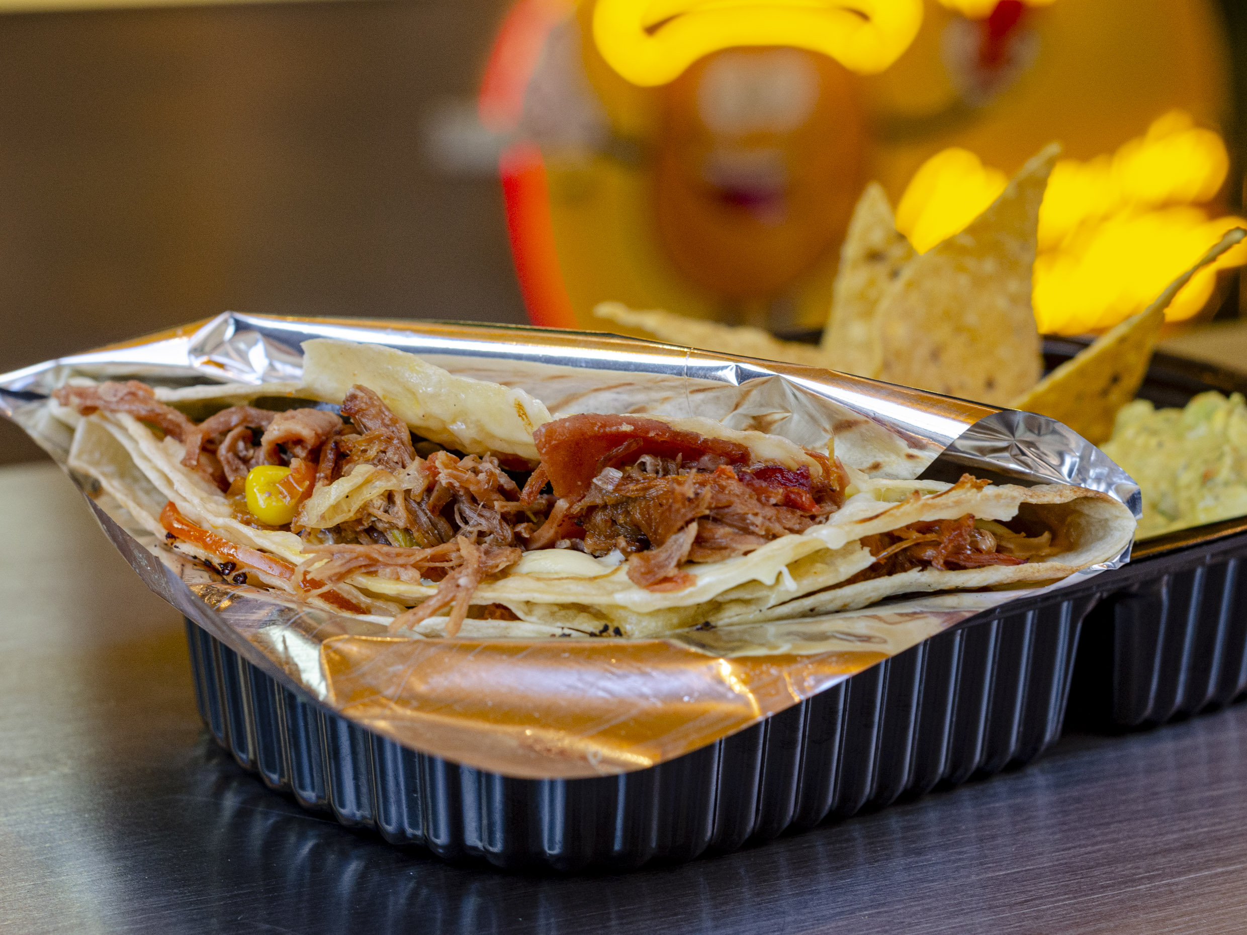 Tortilla de maíz, 100% carne de res desmechada en una mezcla de hogao con maicitos, tocineta, queso mozzarella, vegetales, pepinillos artesanales, sour cream, queso rayado, guacamole artesanal, salsas artesanales acompañado de papas artesanales o nachos con guacamole artesanal.