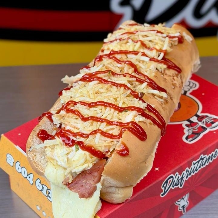 Pan Artesanal, Salchicha Americana, tocineta y queso mozzarella fundido,ripio de papas, salsa animal style, acompañado de papas artesanales, salsas de la casa y las tradicionales