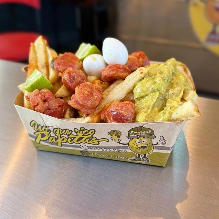 400 g Aproximadamente papas artesanales, 2 huevos de codorniz, Chorizo artesanal, guacamole artesanal, limón, salsas de la casa