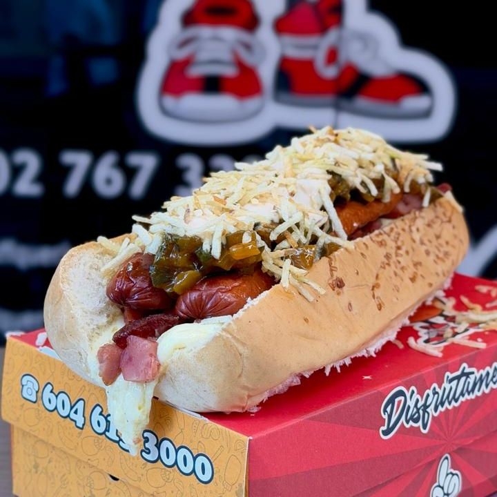 Pan artesanal, salchicha Premium Zenu, ensalada de la casa, tocineta y queso mozzarella, ripio de papas y salsas de la casa artesanales y tradicionales, acompañado de papas artesanales