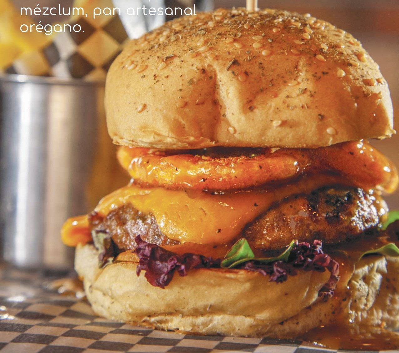 Pan artesanal de Orégano, Blend de carne de res y cerdo, Queso de búfalo apanado, Reducción de tocino premium en salsa BBQ y whisky, Cebolla morada asada, tomate fresco y lechuga romana, Queso cheddar