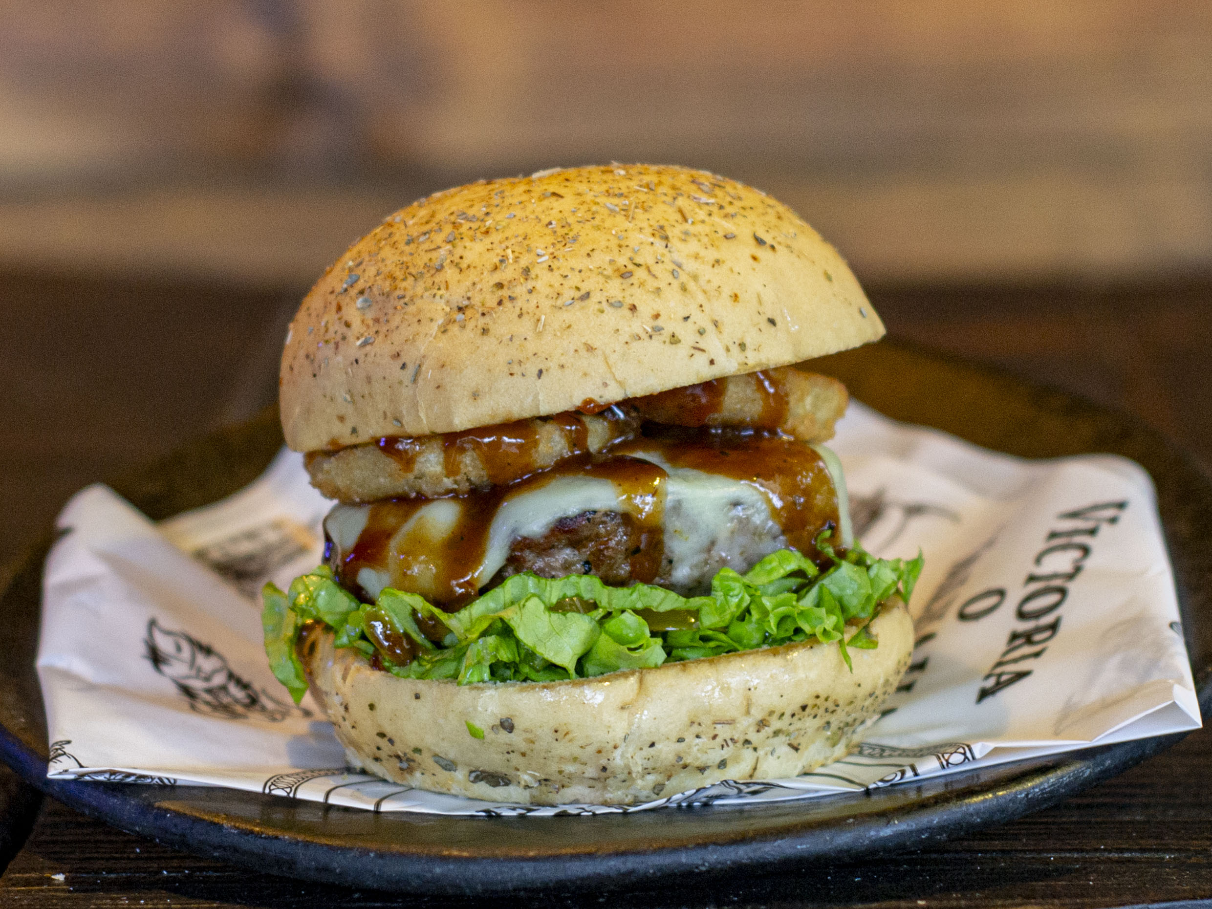 160 g Carne de búfala asada a la parrilla, 130 g de pulled pork bañado en salsa jagermeister, queso cheddar, dedos de queso apanados, cebolla en puerro crocante caramelizada en vino tinto, pan artesanal parmesano.
