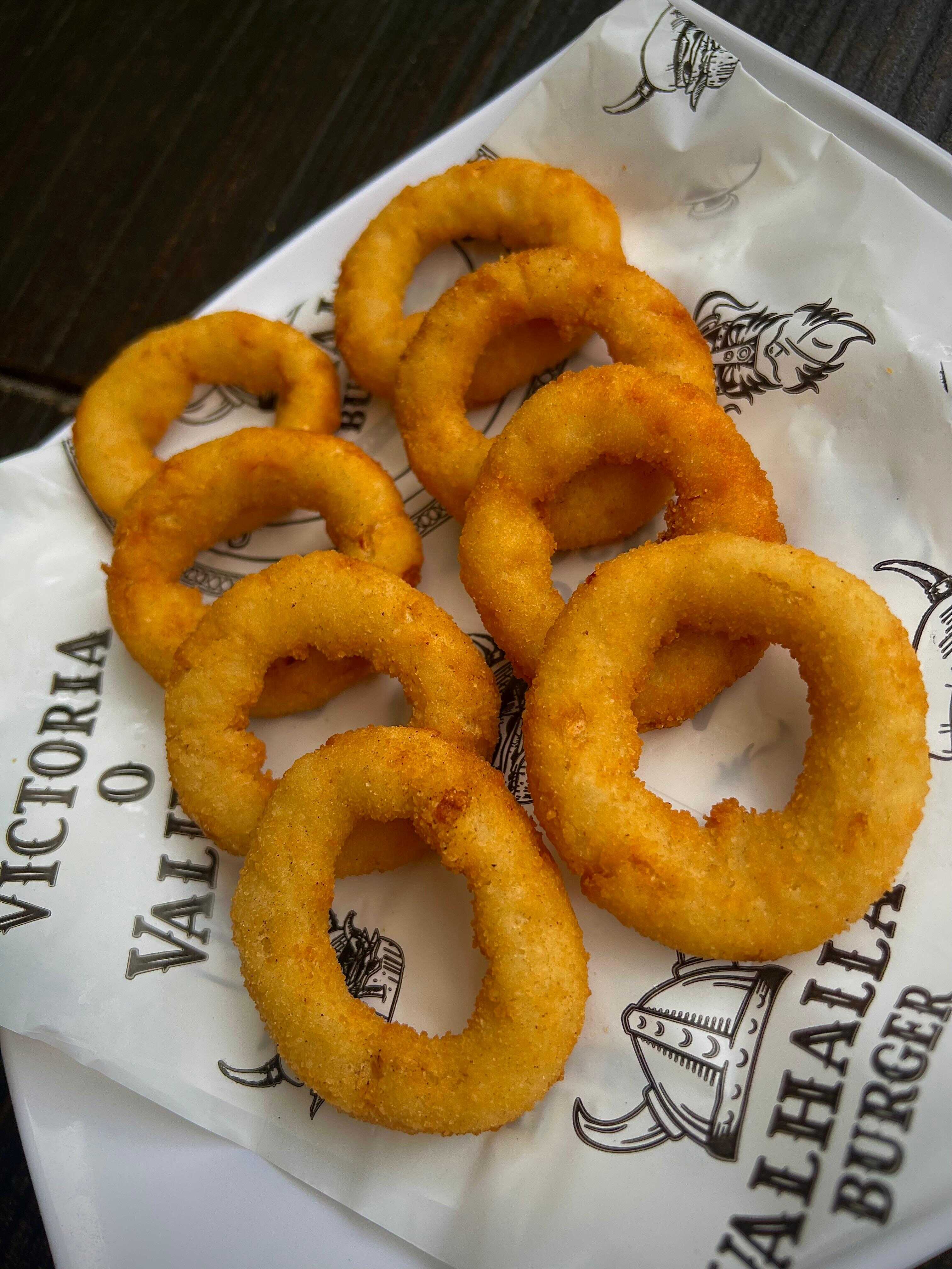 8 Aros de cebolla apanados acompañados de mayonesa de maracuyá y salsa de ajo.