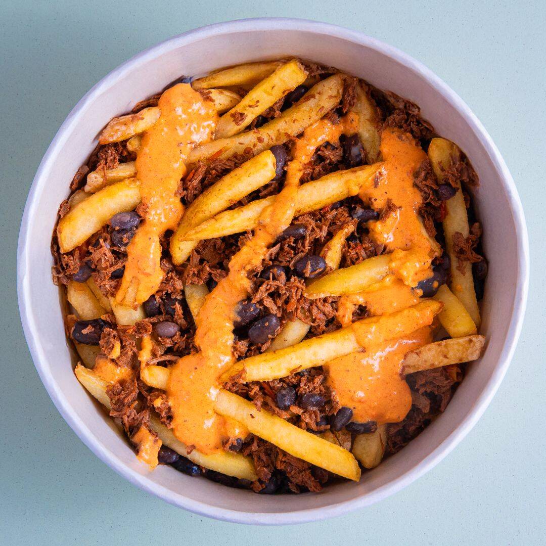 Papas a la francesa acompañadas de carne desmechada vegetal, frijol caraota, salsa medio picante y cebolla encurtida.