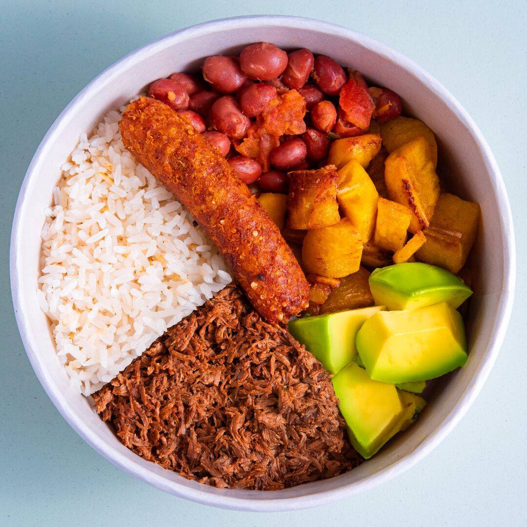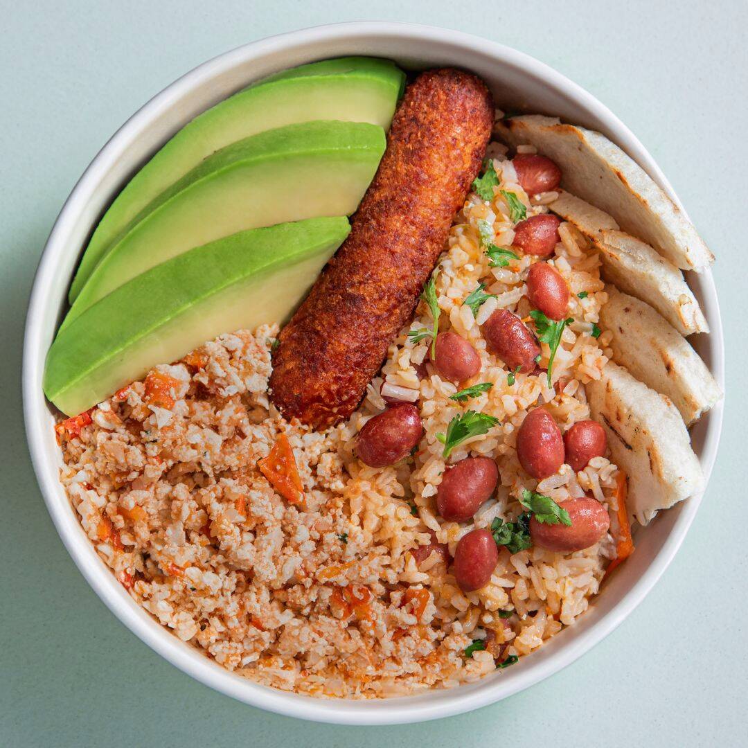 Plato 100 vegano. arroz a elección, fríjol cargamanto, carne desmechada vegetal, chorivegano, plátano maduro y agaucate.