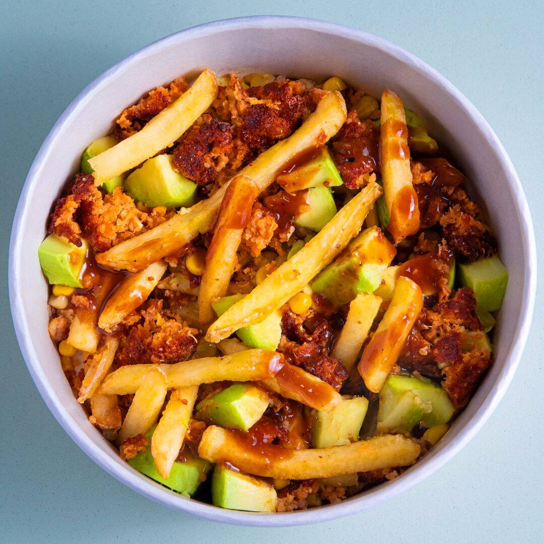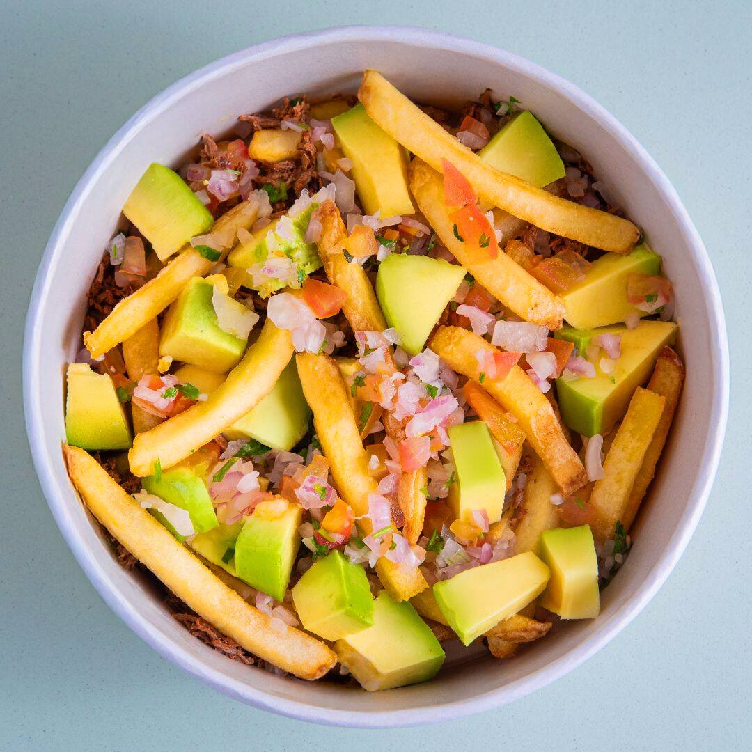 Papas a la francesa acompañadas de carne desmechada vegetal, pico de gallo y aguacate.