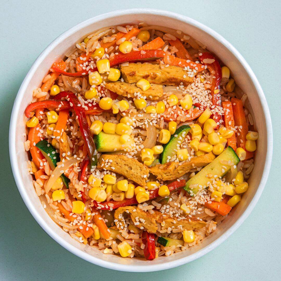 Plato 100 vegano. arroz salteado al wok en salsa de oriental con pollo desmechado vegetal de soya, champiñones salteados, pimetón y cebolla larga. libre de gluten libre de gluten