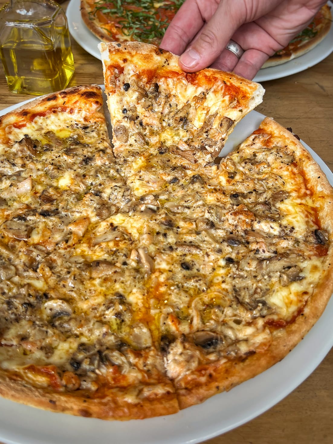 Pizza de 6 porciones. Ingredientes: masa delgada y tienen salsa napolitana hecha en casa, mozzarella, pollo desmechado y champiñones frescos en salsa blanca.
