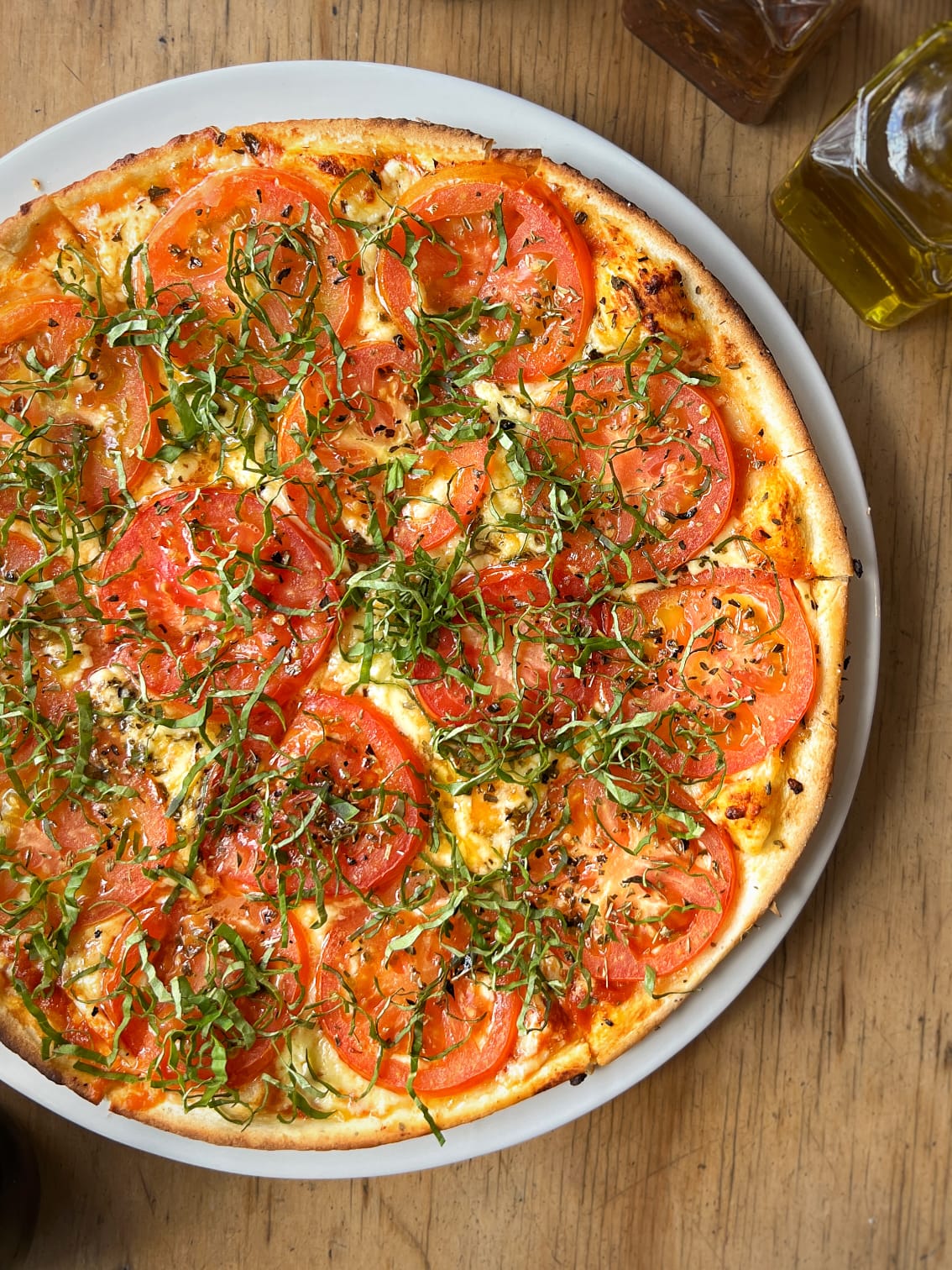 Pizza de 6 porciones. Ingredientes: masa delgada y tienen salsa napolitana hecha en casa, mozzarella, tomate en rodajas y albahaca.