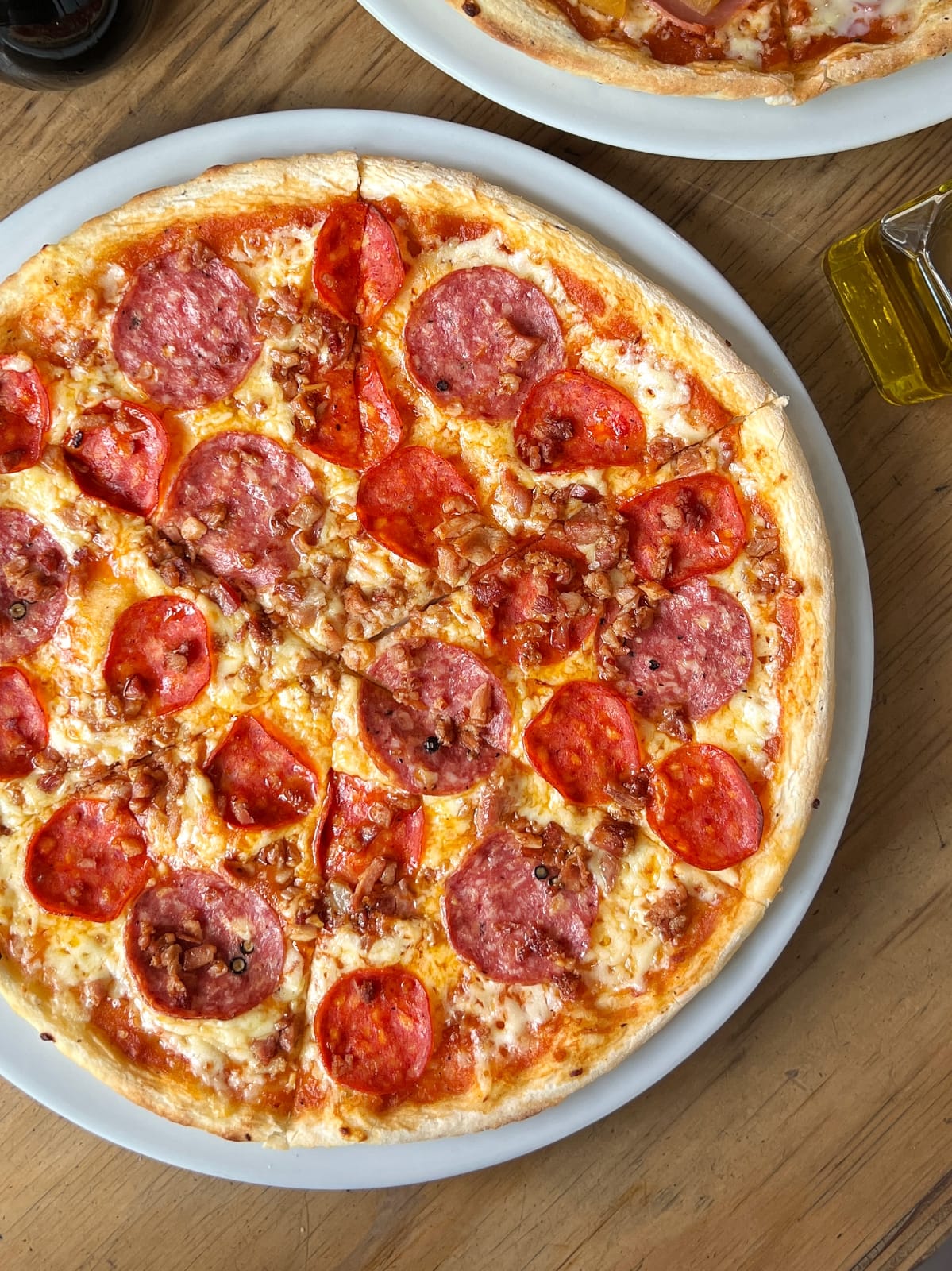 Pizza de 6 porciones. Ingredientes: masa delgada y tienen salsa napolitana hecha en casa, mozzarella, pepperoni, salami y tocineta.