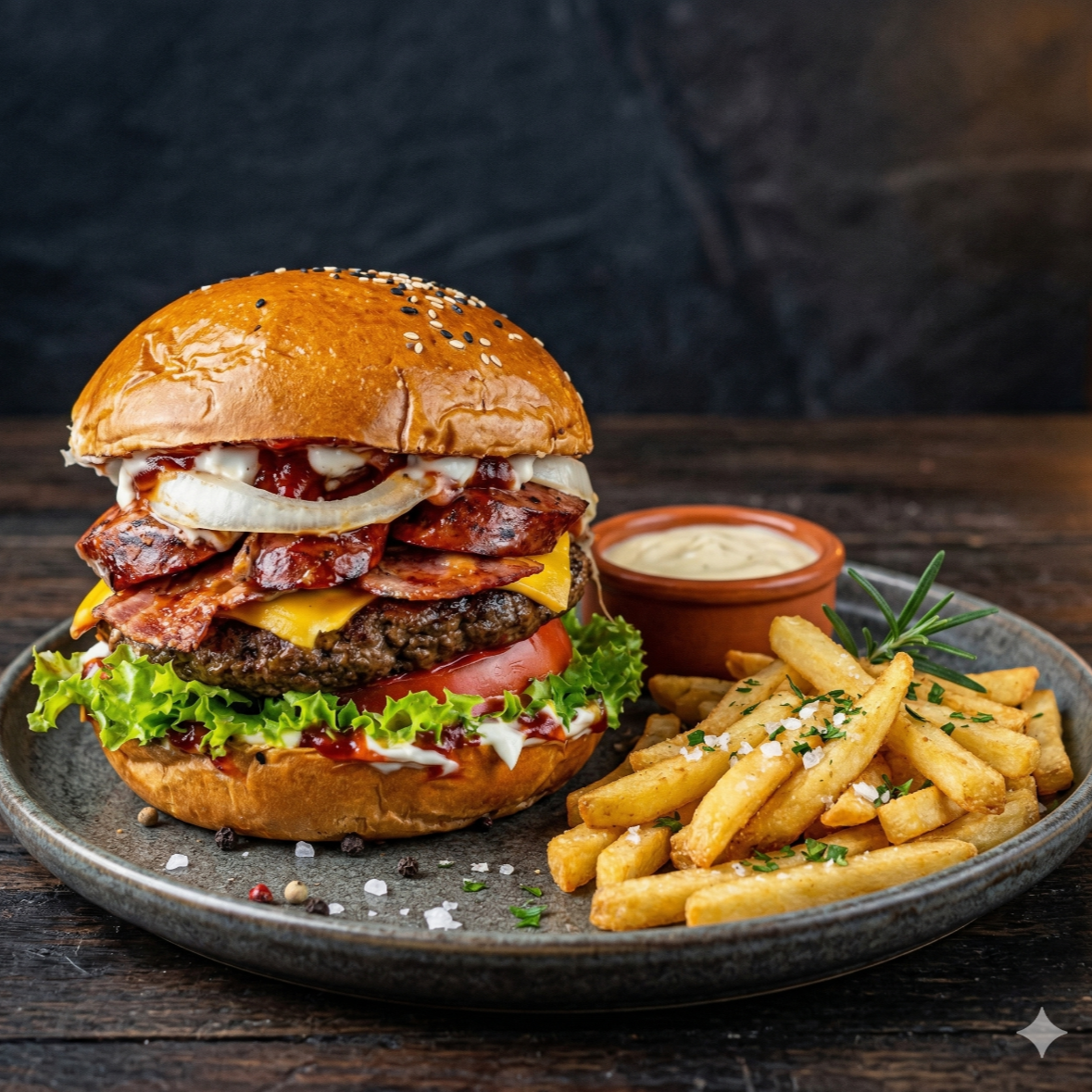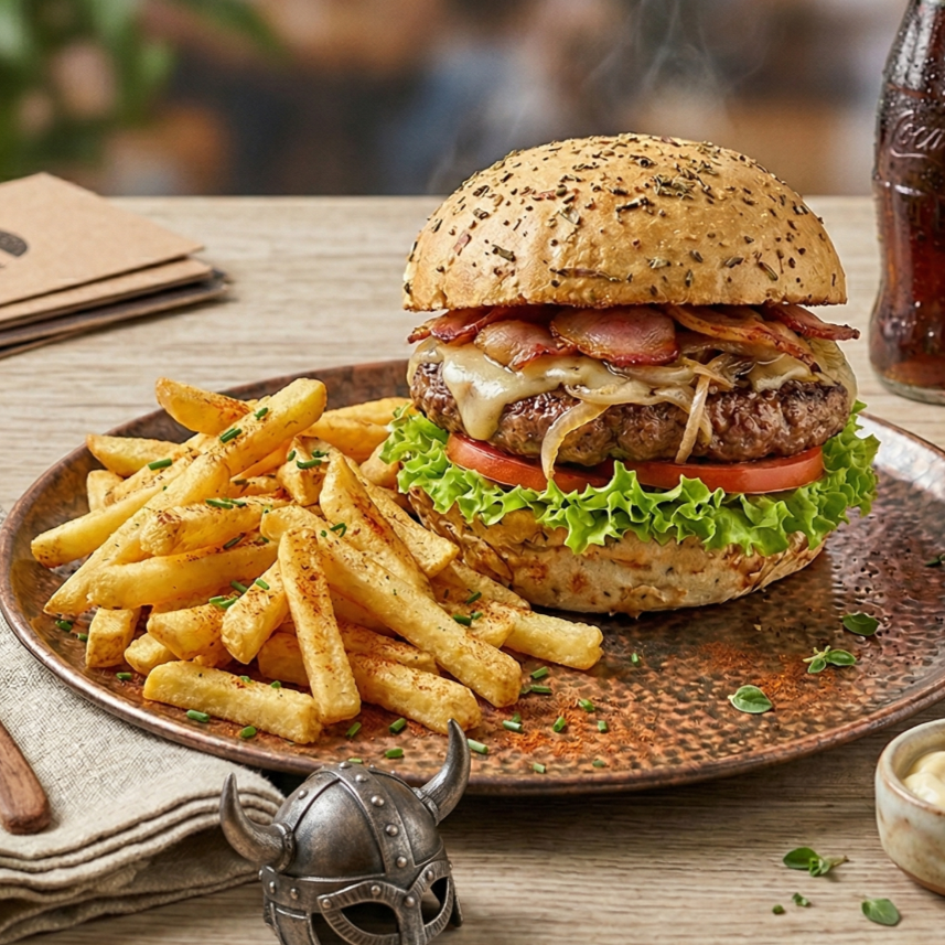 Hamburguesa personal: 120 g De carne, queso, tocineta, cebolla caramelizada, lechuga, salsas de la casa + Papas a la francesa.