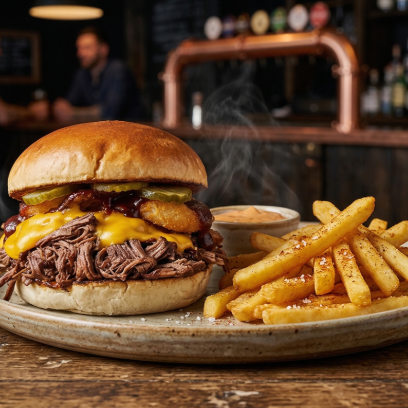 Porcion personal: 200 g De carne, chicharrón caramelizado, aros de cebolla, queso, tocineta, lechuga, cebolla caramelizada.