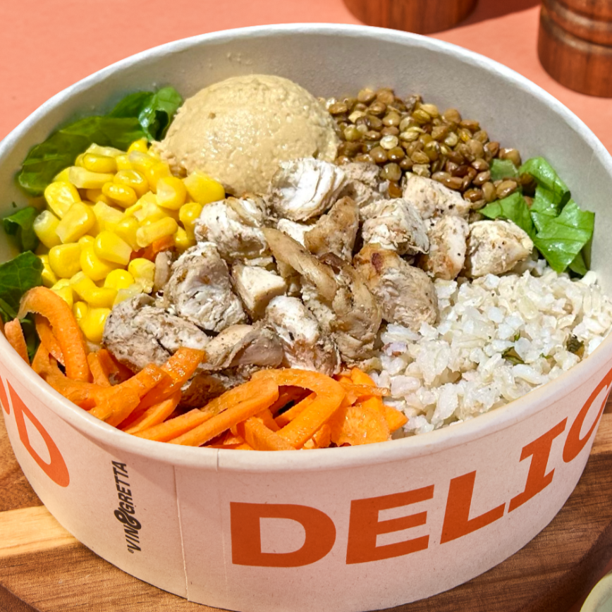 Bowl totalmente fresco para tu día a día con arroz, lechuga, zanahoria, maíz, pollo o falafel, hummus tradicional, lentejas crocantes y vinagreta a elección: amapola y limón, berenjena y miel mostaza