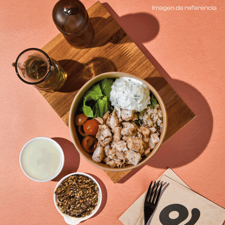 Pollo rostizado, Arroz integral con limón y cilantro, lechuga, tomate cherry, Dip Griego, vinagreta Amapola & limón, Semillas caramelizadas.