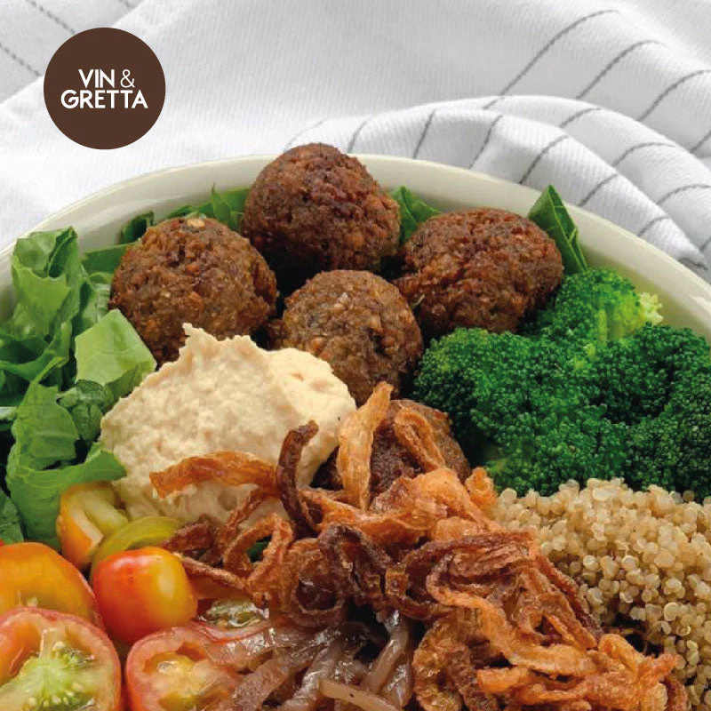 ¡Sabor y frescura en cada bocado! Lechuga crespa morada, falafel dorado, tomates cherry, brócoli cocido, dip griego, hummus chipotle, vinagreta de amapola y puerro crispy. Sabores intensos y frescos, en una versión completamente vegetariana.