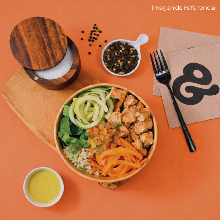 Arroz integral con limón y cilantro, pollo rostizado, zanahoria en espiral, lechuga romana, zucchini, pico de gallo y vinagreta miel mostaza. Ideal para disfrutar una comida completa sin complicaciones.