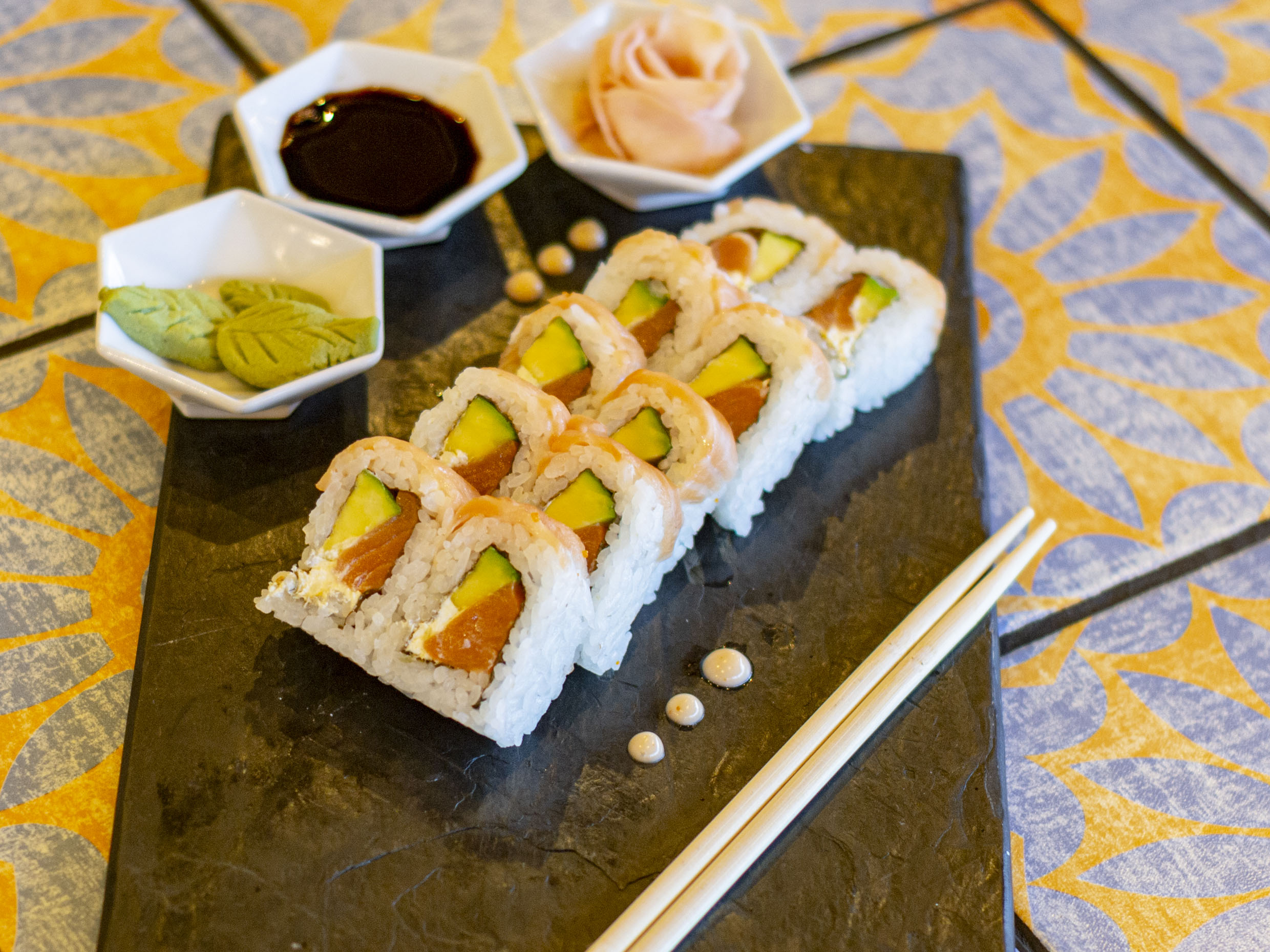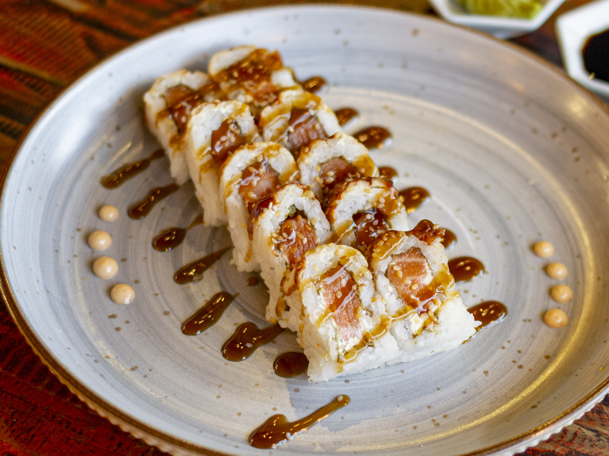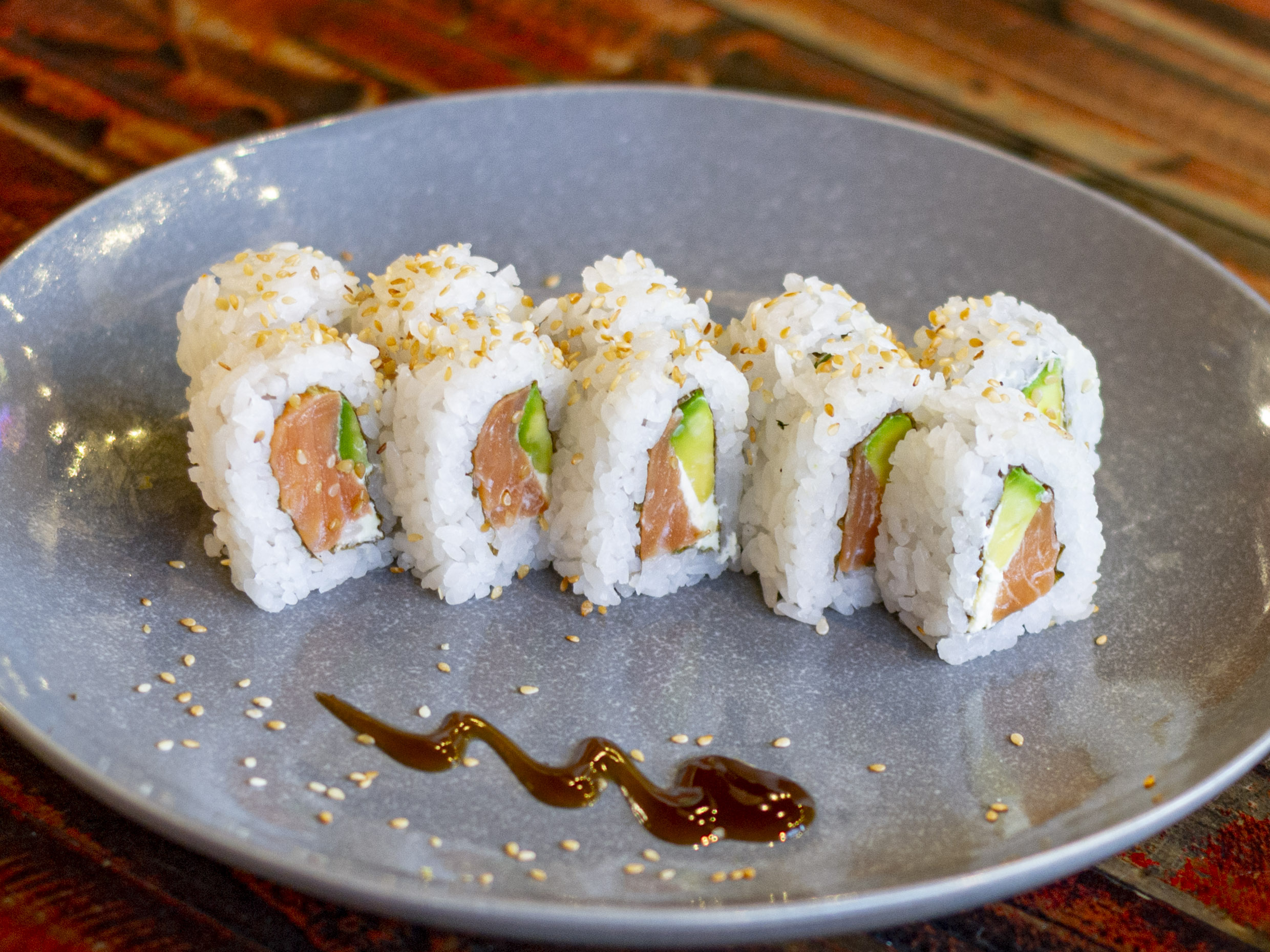 Delicioso rollo relleno de salmón fresco y queso crema, con topping de anguila ahumada, bañado en salsa teriyaki y ajonjolí tostado (10 bocados).