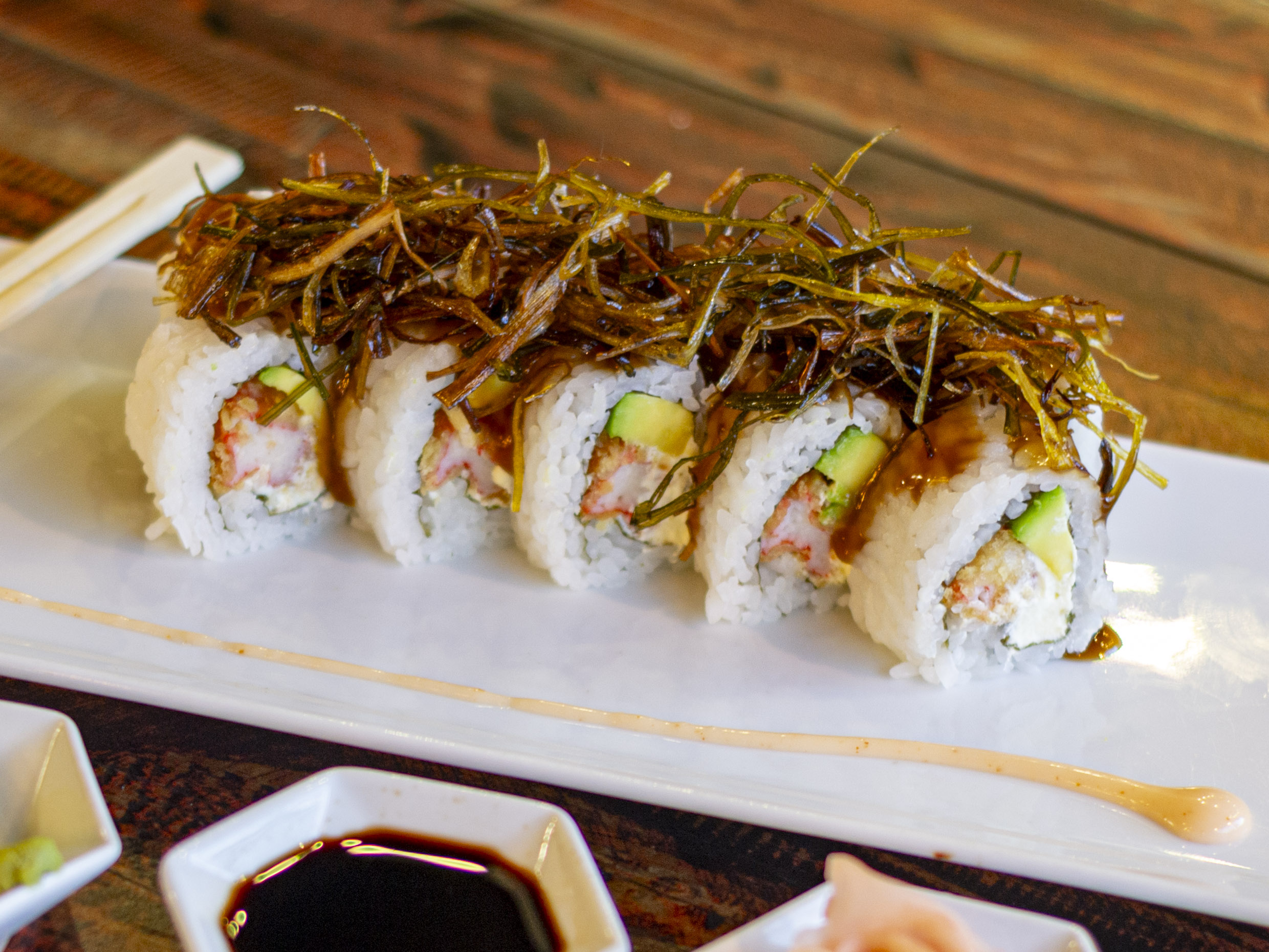 Exquisito rollo de palmito de cangrejo crispy, queso crema y aguacate, con topping de puerro crujiente caramelizado (10 bocados).