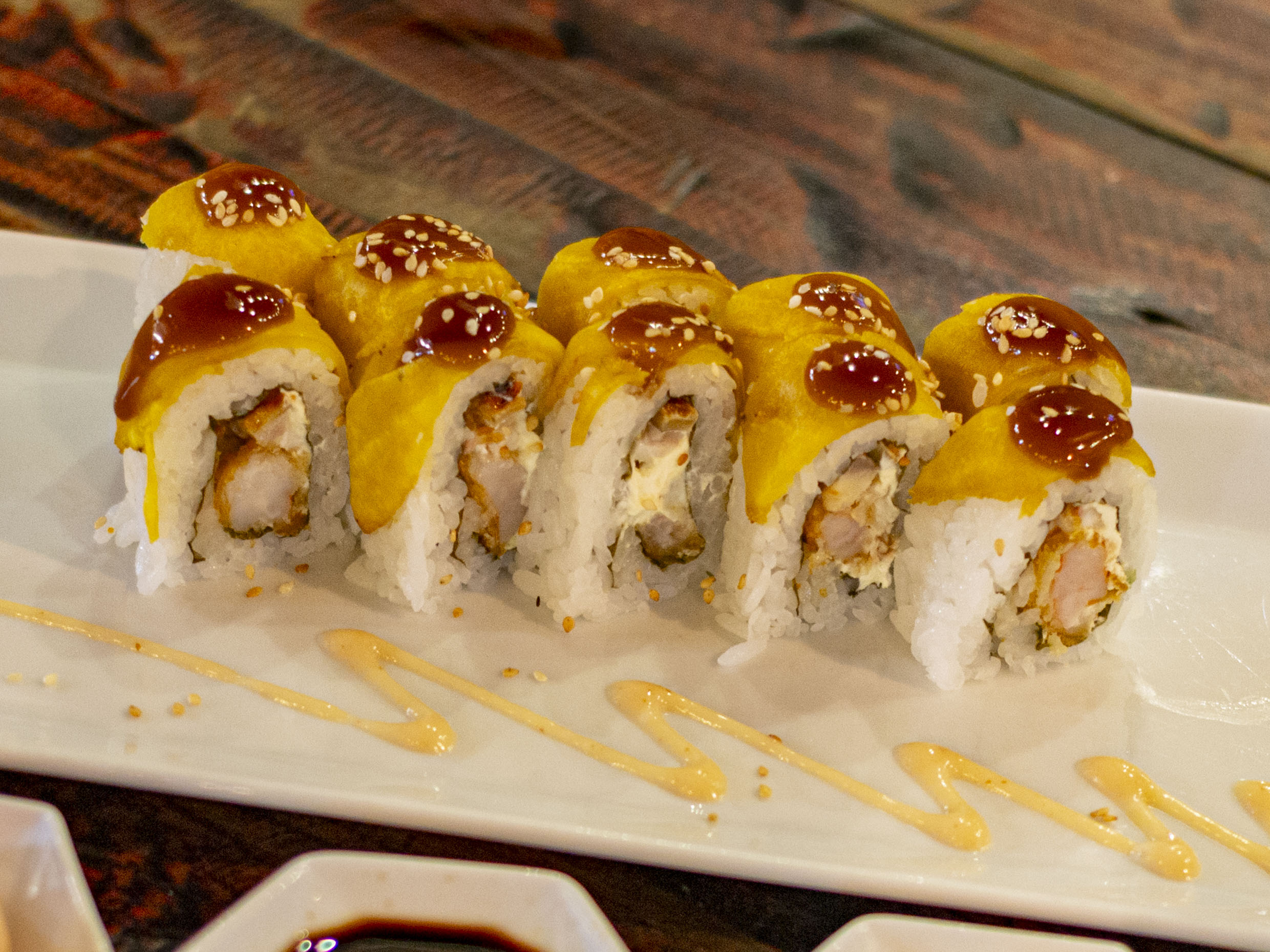 6 Bocados con anguila ahumada, camarón apanado y queso crema, con topping de plátano maduro, bañado en salsa teriyaki y ajonjolí tostado.