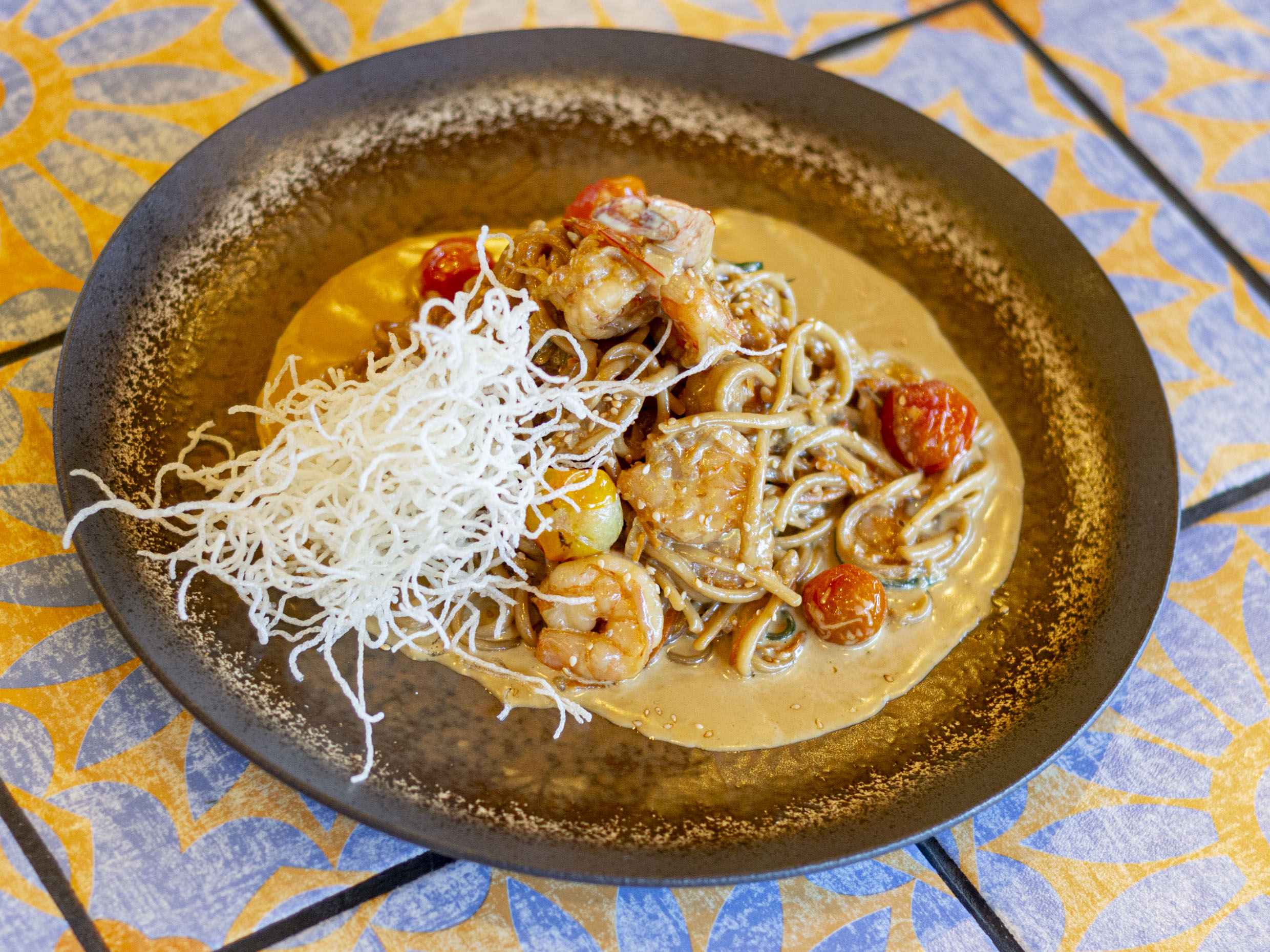 Espaguetis con finas tiras de verduras, tomate cherry confitados, camarones y langostinos salteados al wok con finas hierbas y salsa de soya