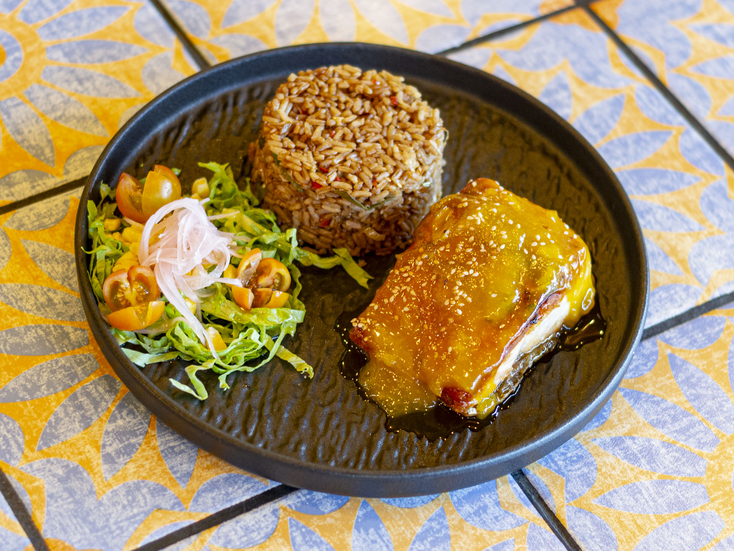 Jugoso filete de salmón en salsa de mango, acompañado de arroz al wok y ensalada fresca.