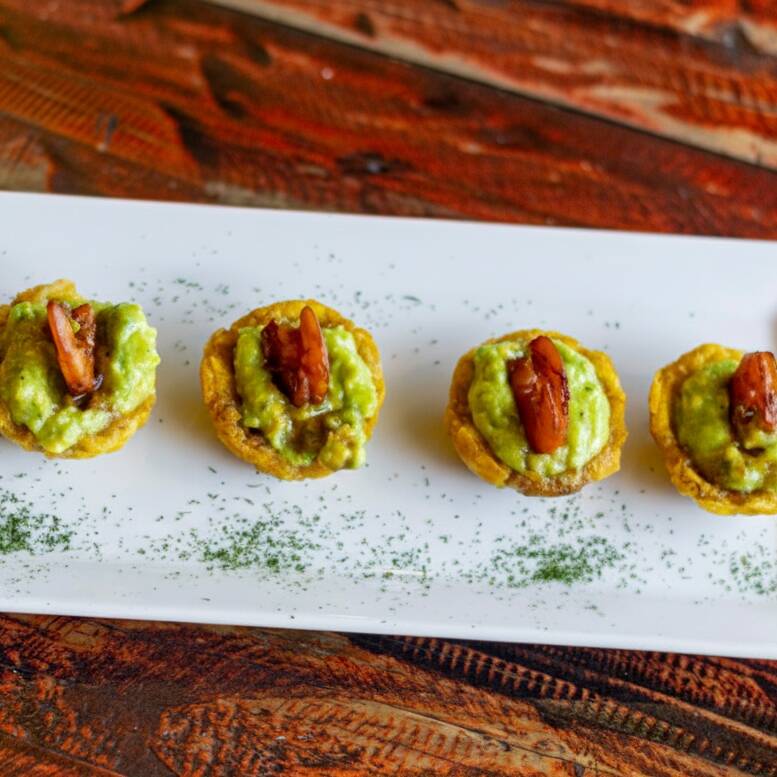 5 deliciosas canasticas crocantes de patacón coronadas con guacamole y chicharroncitos.