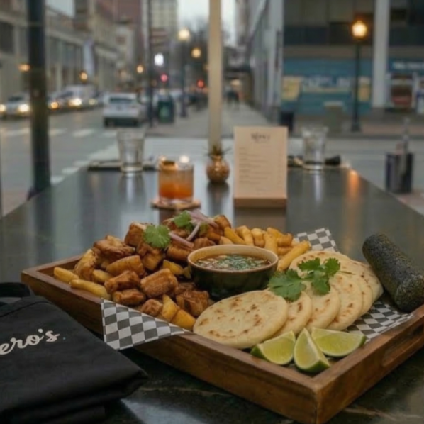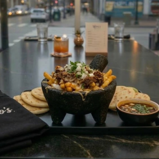 Papas fritas, queso mozarella, carne de birria, guacamole y sour cream.
