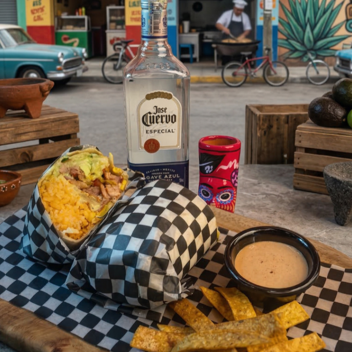 Arroz, frijol refrito, guacamole, lechuga, cebolla, queso y proteína a elegir.