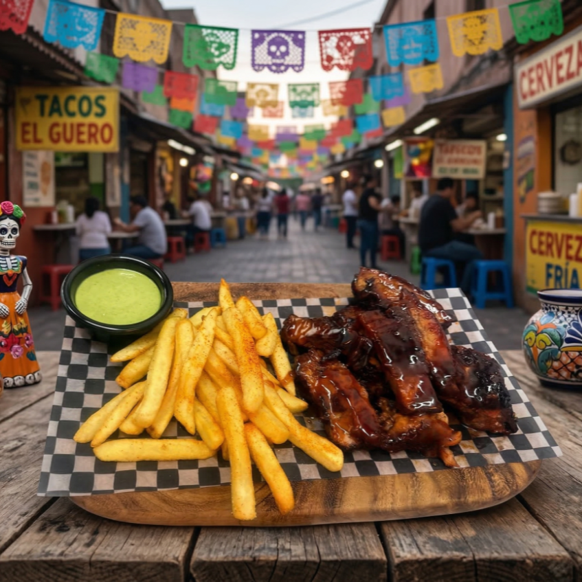 Costillas ahumadas en salsa BBQ, papas y salsa de la casa.