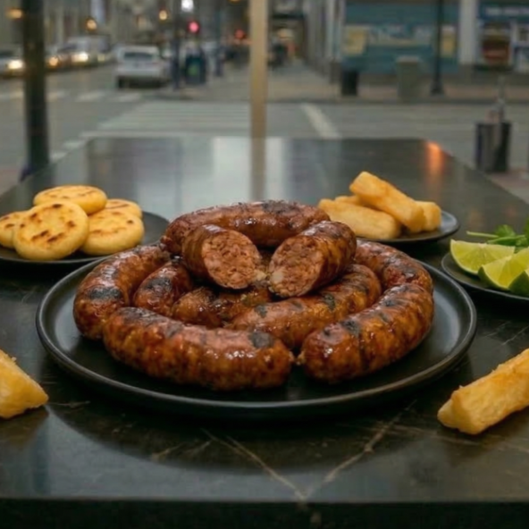 Costilla BBQ, tocino, chorizo, morcilla, papas, arepitas, chimichurri y salsa.