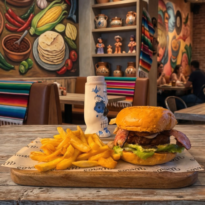 150 g De res, piña, tocino, lechuga, cebolla, papas, guacamole y salsas.