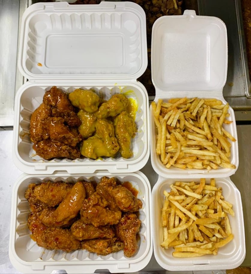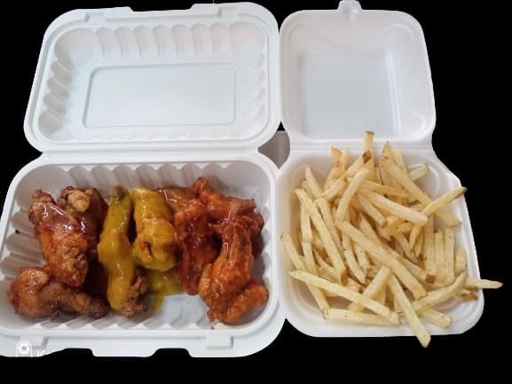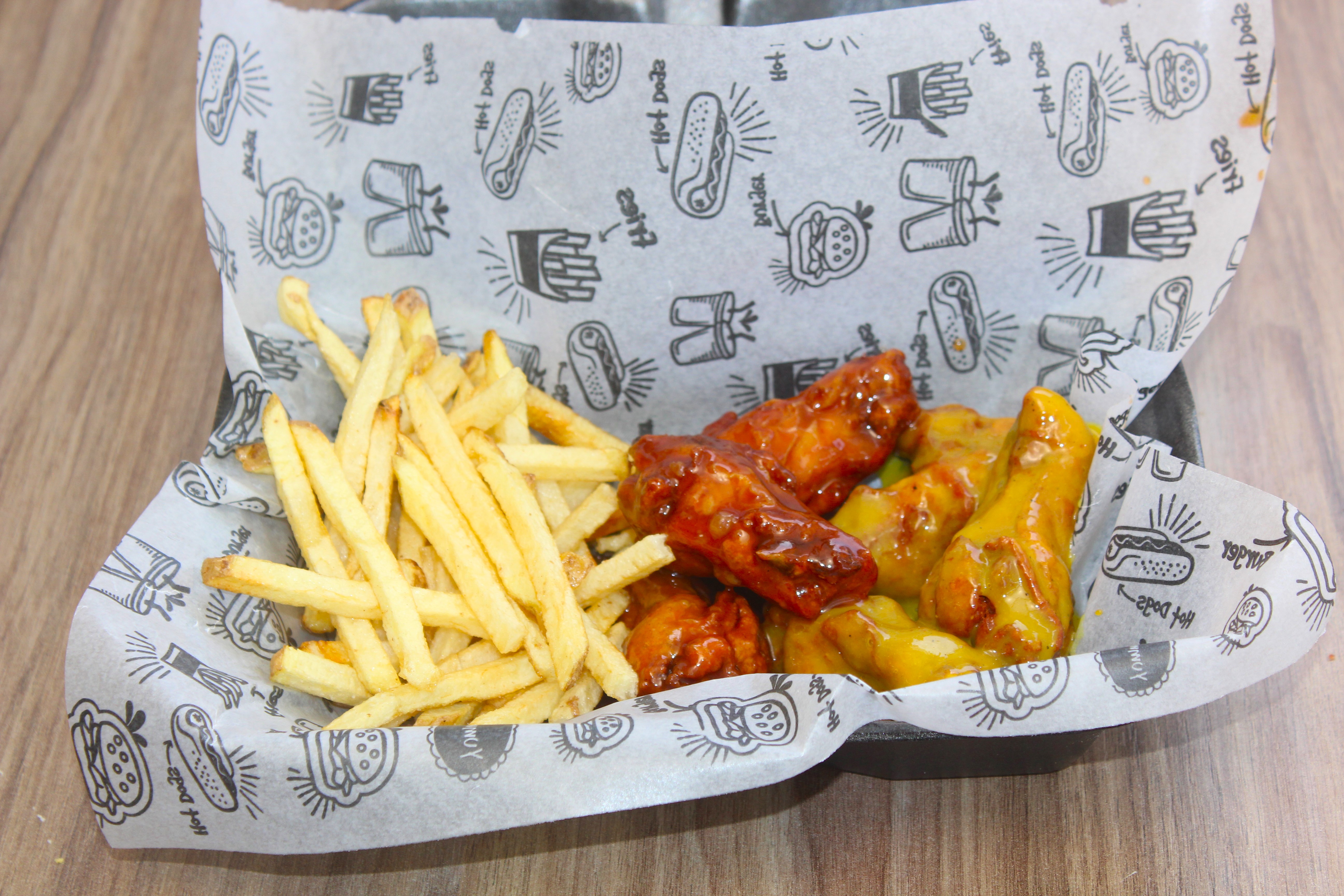 6 alitas bañadas de 2 tipos de salsa a elección acompañadas de 150gr de papas a la francesa