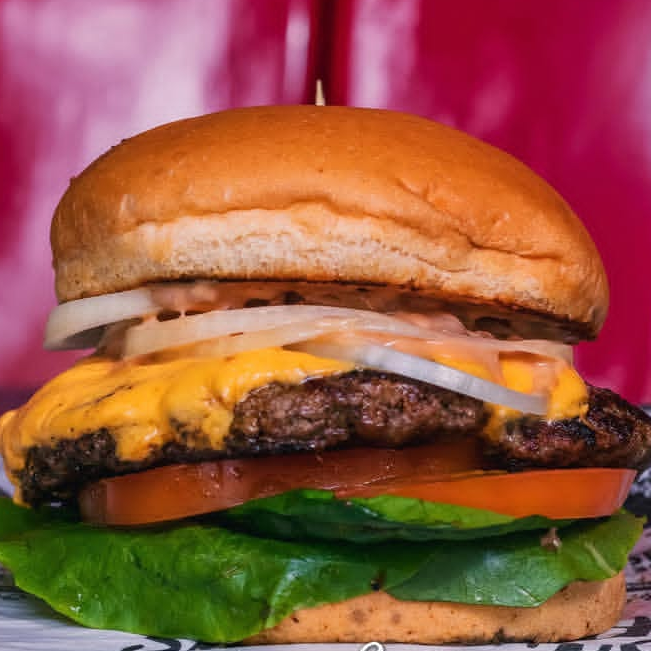 Pan, carne de res Angus, queso, tocineta ahumada, pepinillos.