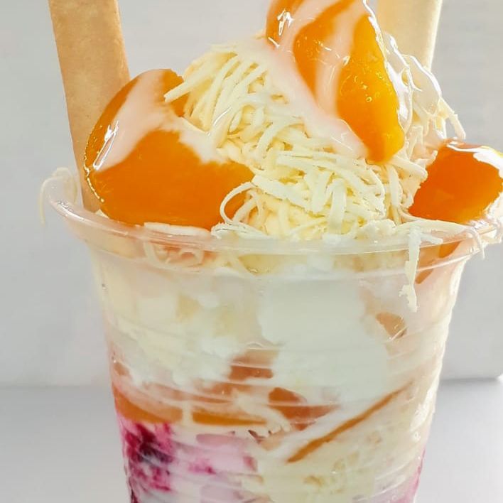 Variedad de fruta, crema de leche, lecherita, 1 porción de helado vaso 16 onzas.