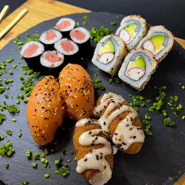 2 Croquetas de Cangrejo + 2 Nigiris de Salmón + 4 California roll +6 temakis de atun
