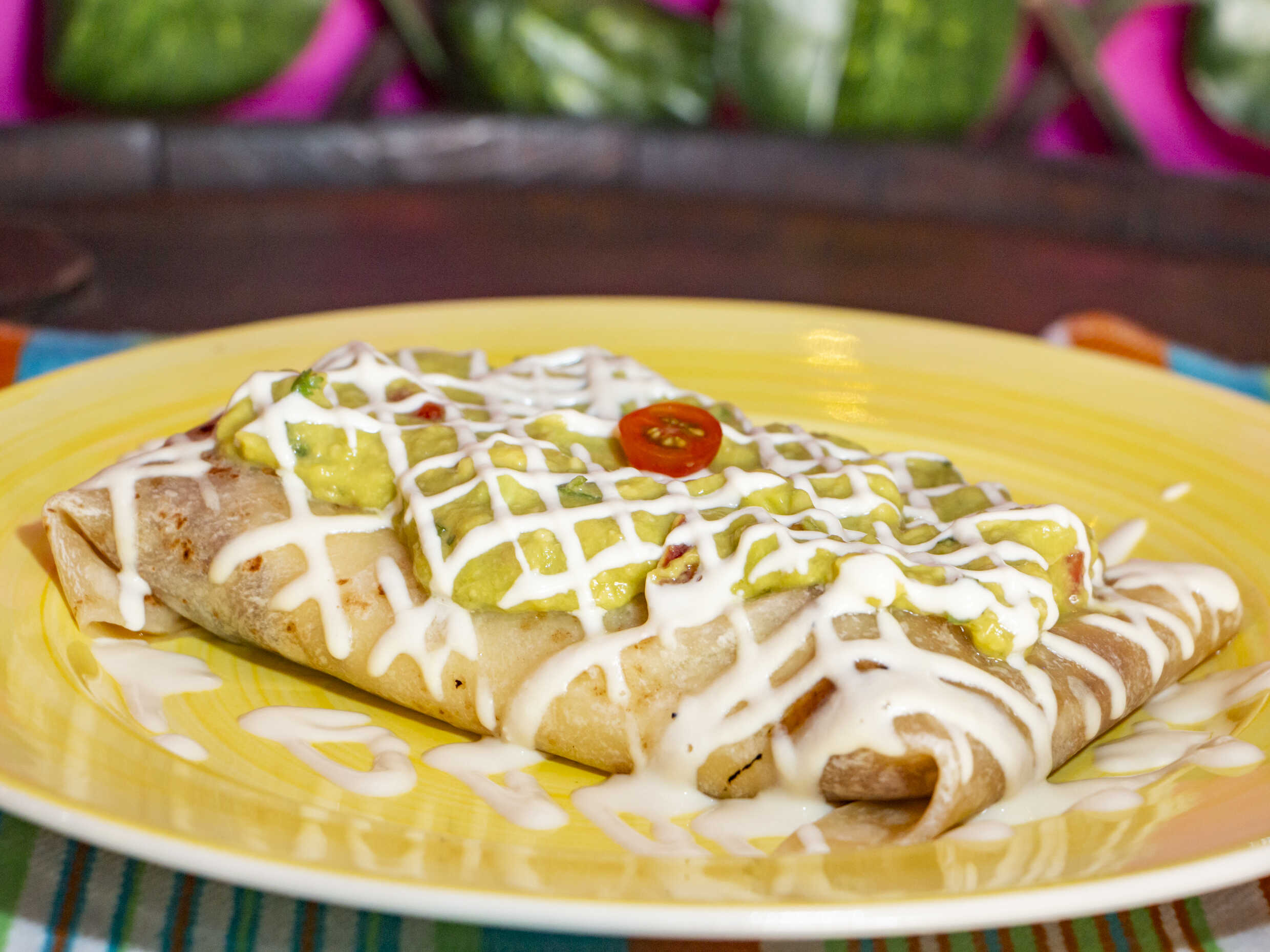 Tortilla de harina rellena de carne, pollo, tocineta, crema, queso y guacamole.