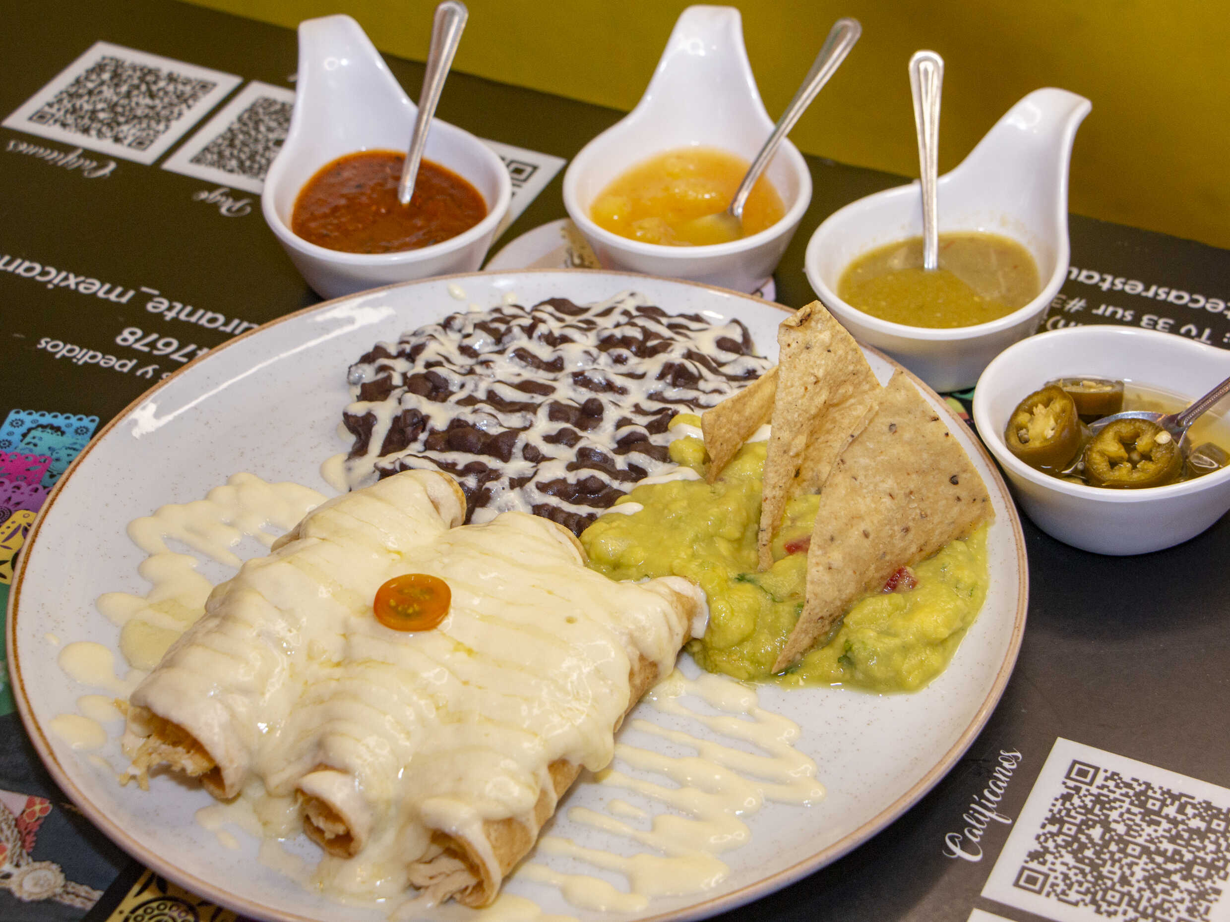Tres tortillas de maíz, pollo desmechado, salsa, crema suave o picante, queso, acompañado de frijol refrito y guacamole.