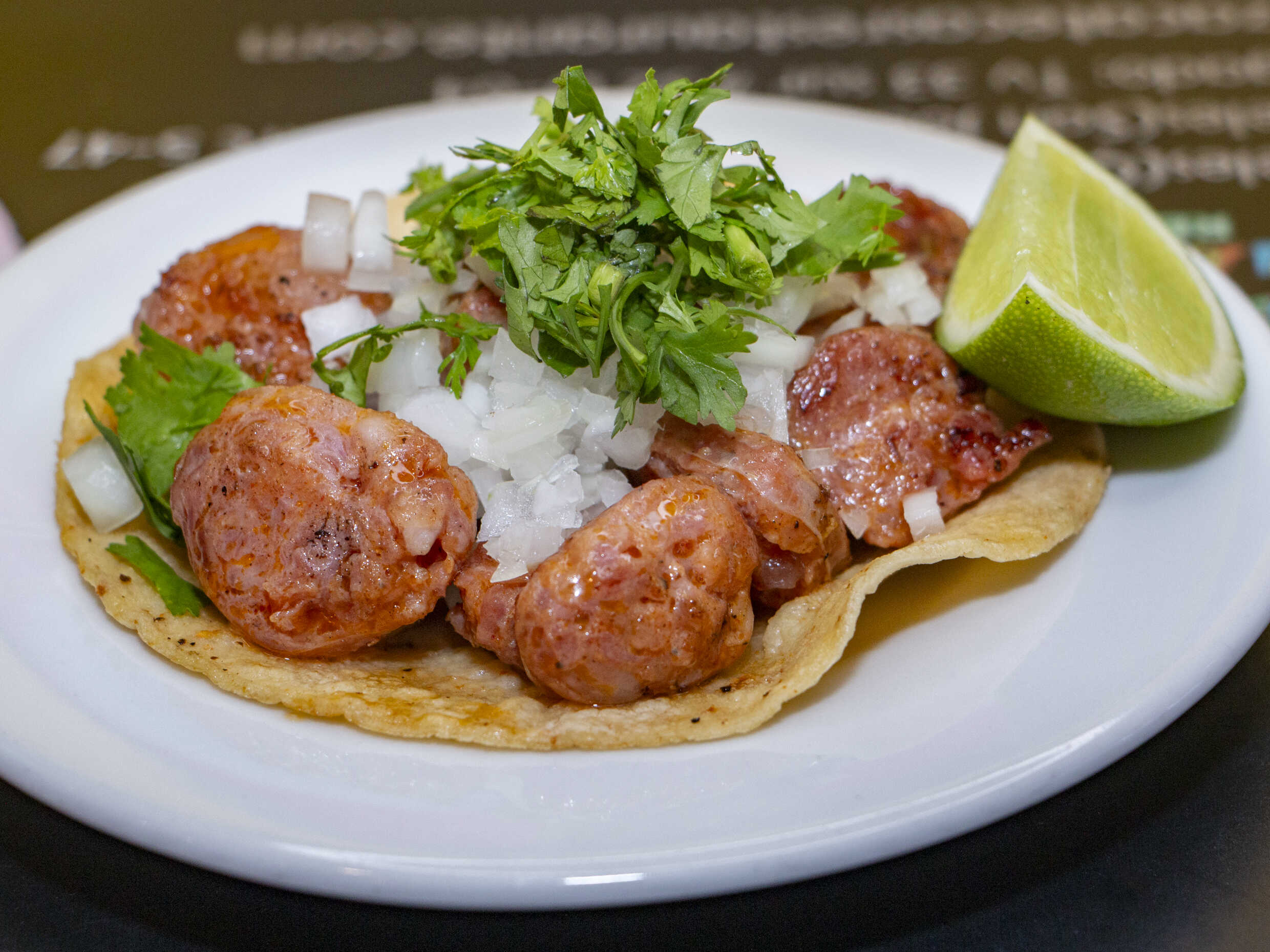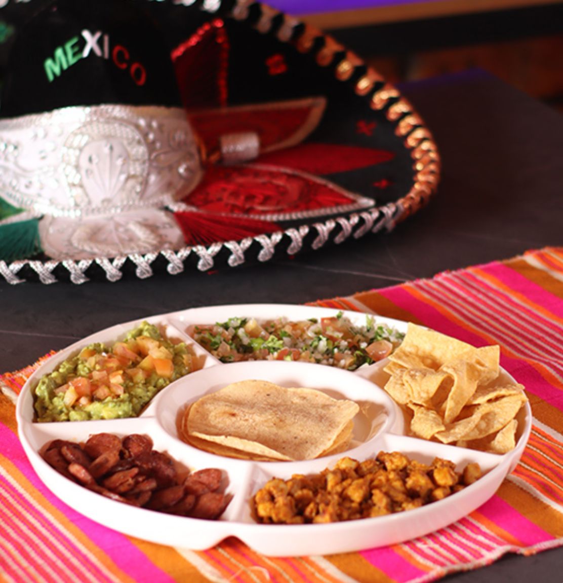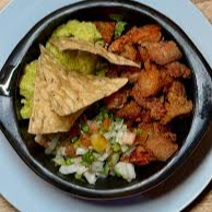 Carne chorizo, pico de gallo, guacamole, nachos, y tres tortillas de maíz.