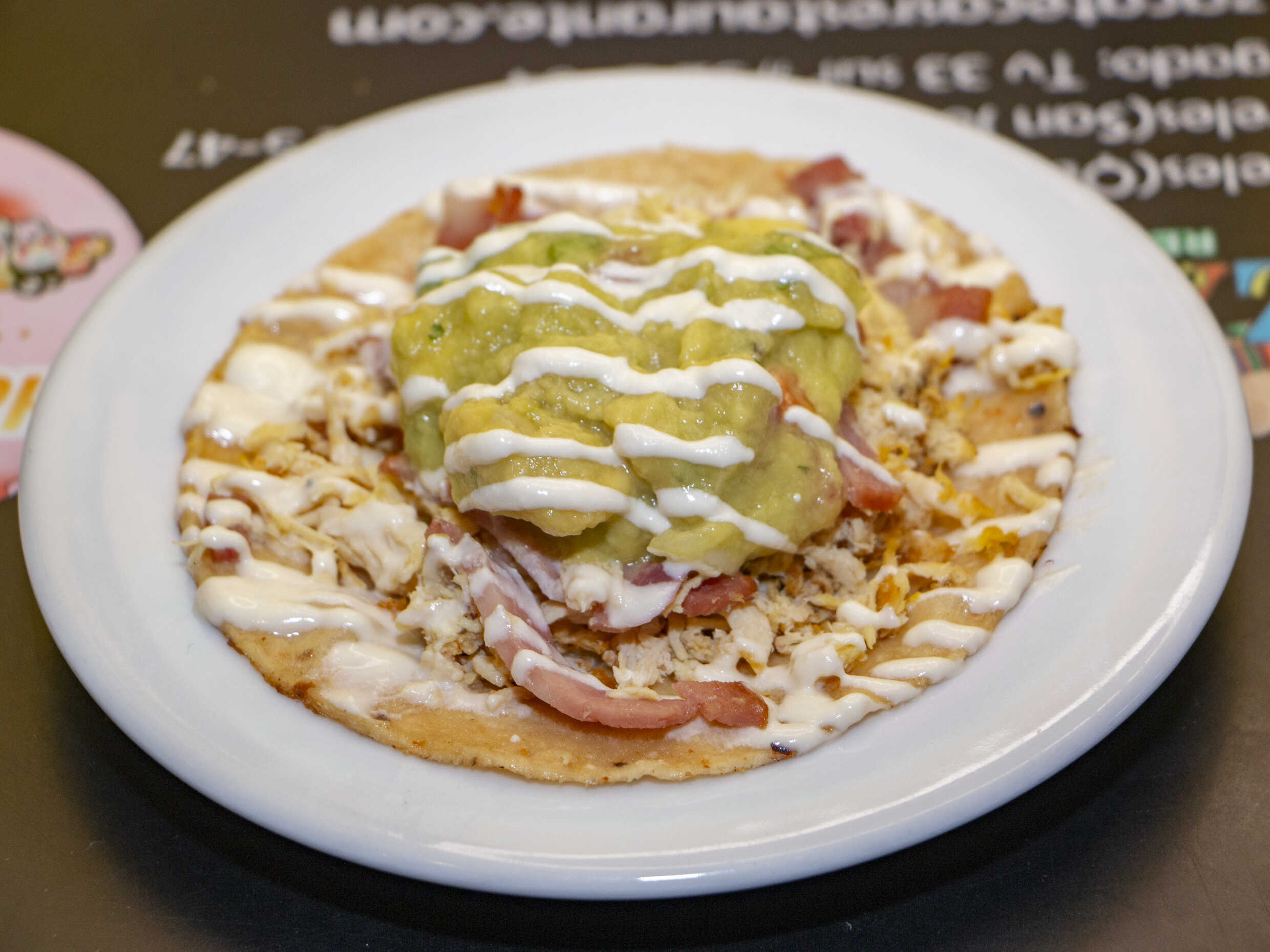 Tortilla gruesa de maíz con una cama de frijol, queso, chicharrón, pollo, lechuga, aguacate y crema.