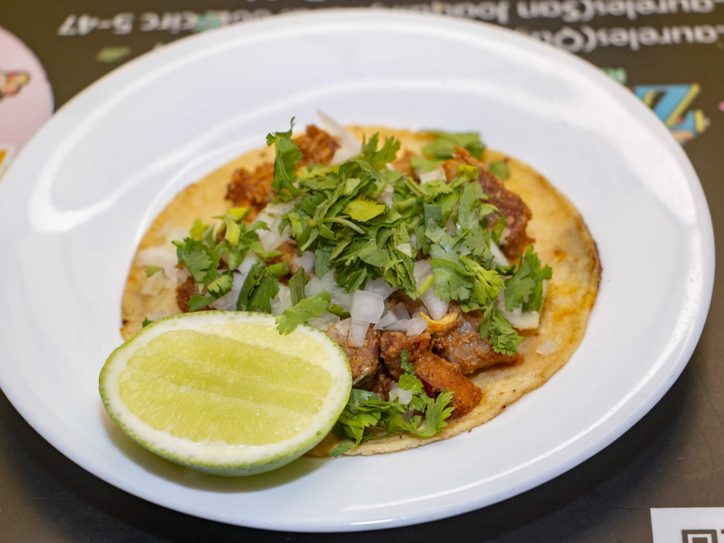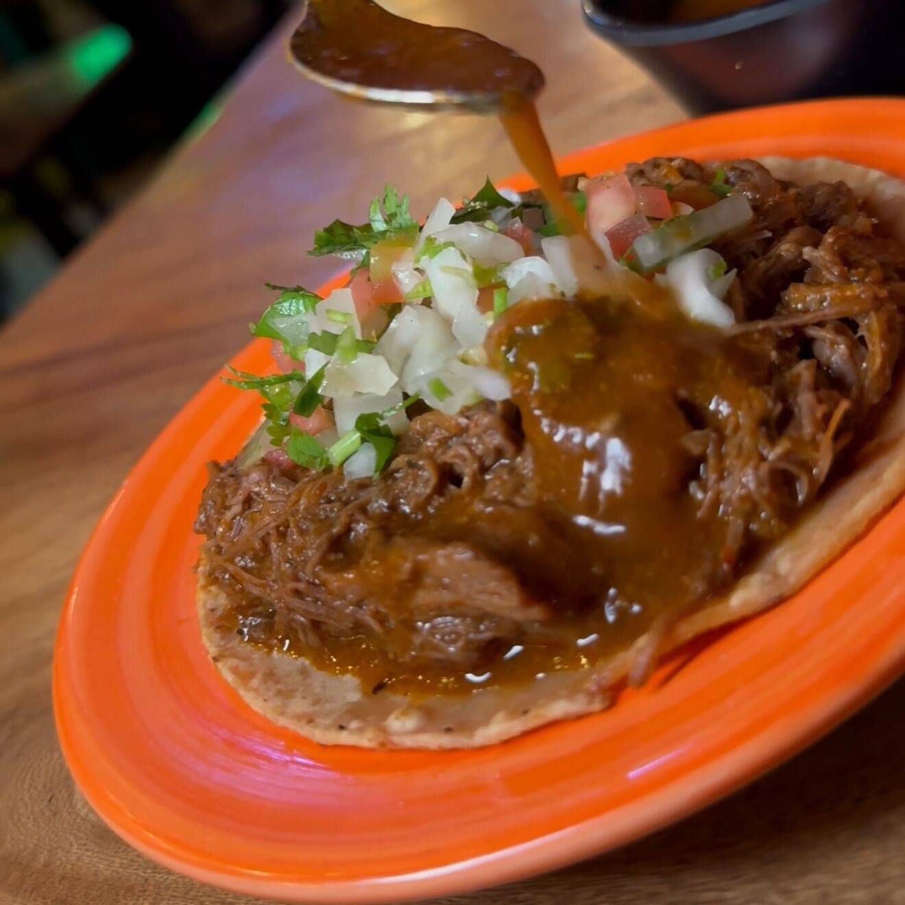 tortilla de maiz crujiente carne de birria pico de gallo queso crema lechuga guacamole