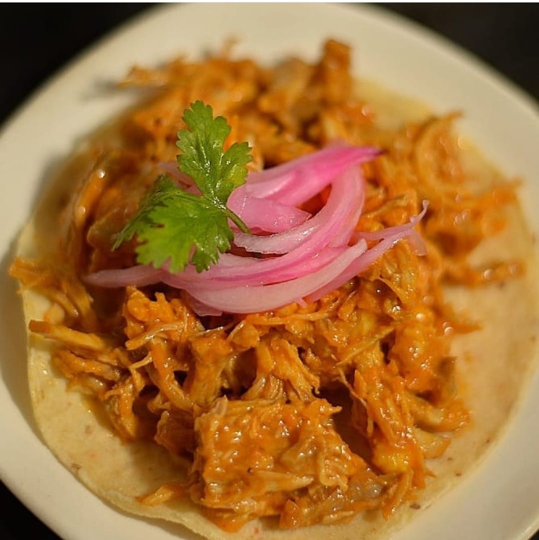 Tortilla de maíz, carne de cochinita, salsa, lechuga, queso y crema suave o picante.
