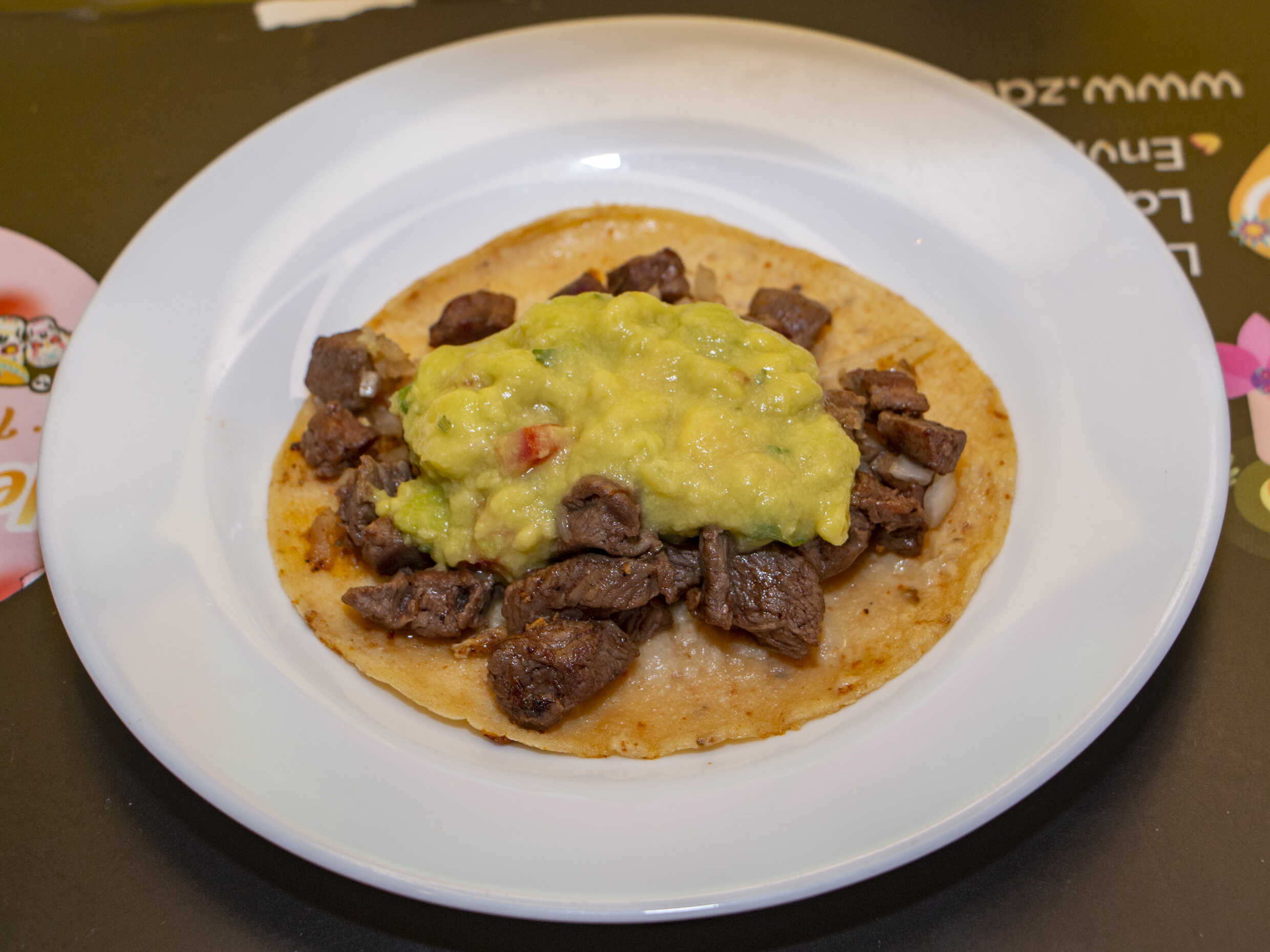 Carne de res, acompañada de frijol, guacamole, 1 tortilla rellena de pollo y 3 tortillas de maíz.