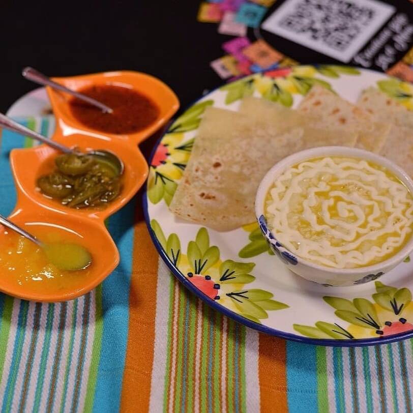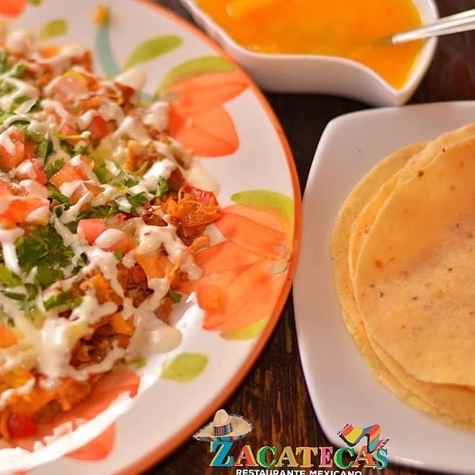 Tortilla de harina, queso, tinga de pollo, pollo en salsa picante, crema, guacamole y nachos.