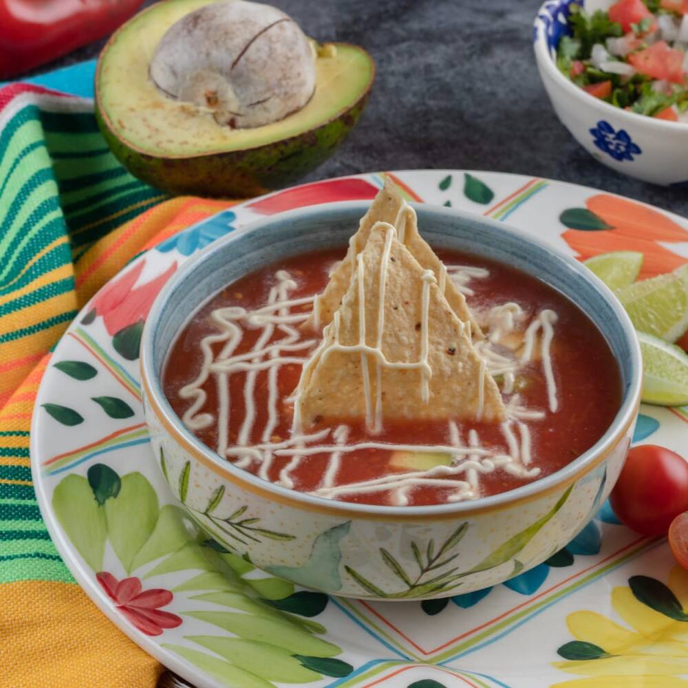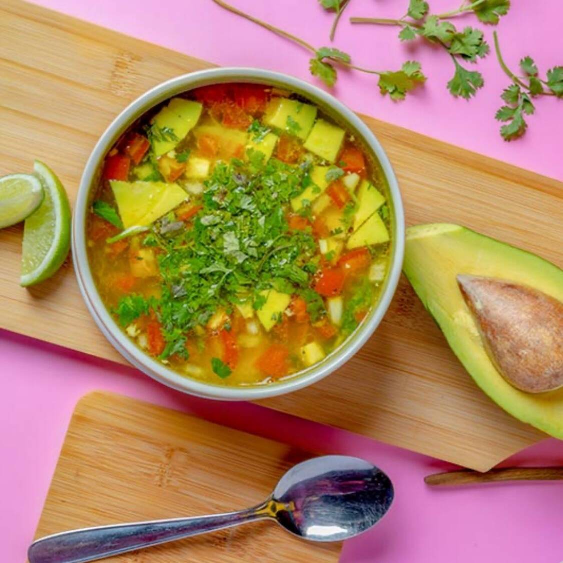 caldo de pollo con pollo desmechado pico de gallo y aguacate