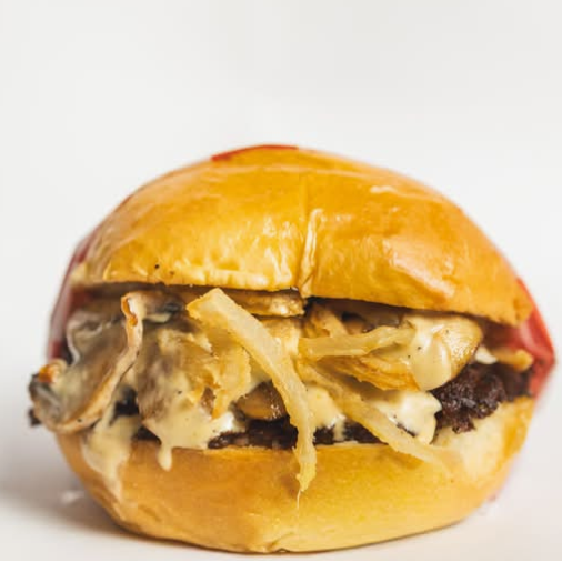 Torta smash, queso suizo, hongos salteados, cebolla crispy, mayo house y acompañamiento