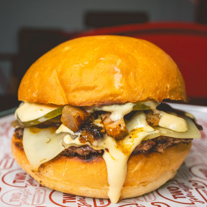 Doble Torta Smash, queso americano, tocineta, tomate cherry confitado, mayonesa Aioli.